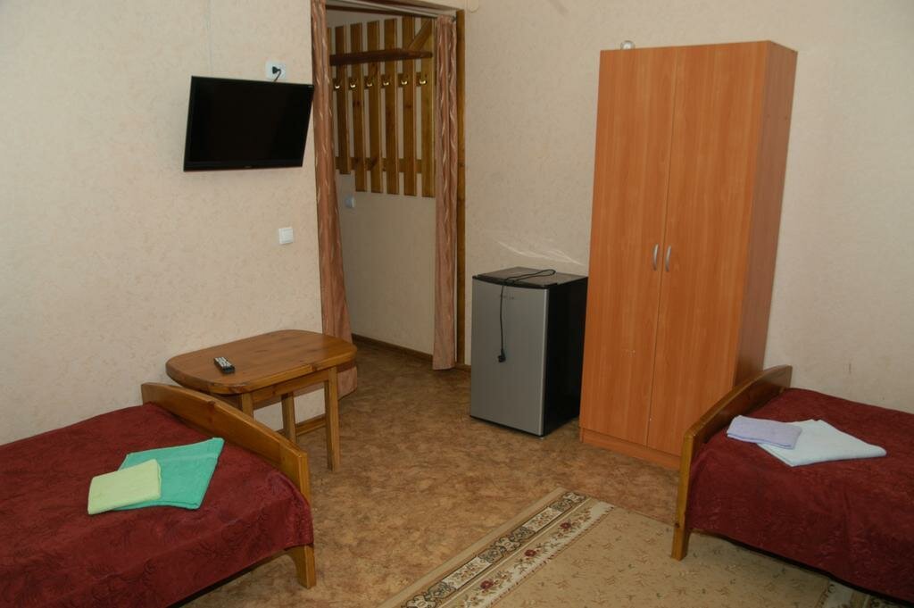 Две раздельные кровати, шкаф, холодильник в номере ,ТВ, душ, умывальник, унитаз , плоский ТВ, комплект полотенец,пользование кухней,мангалами,автостоянкой Скидки от двух суток.Полный пакет отчетных документов ,QR чек. Номеров несколько.Звоните.