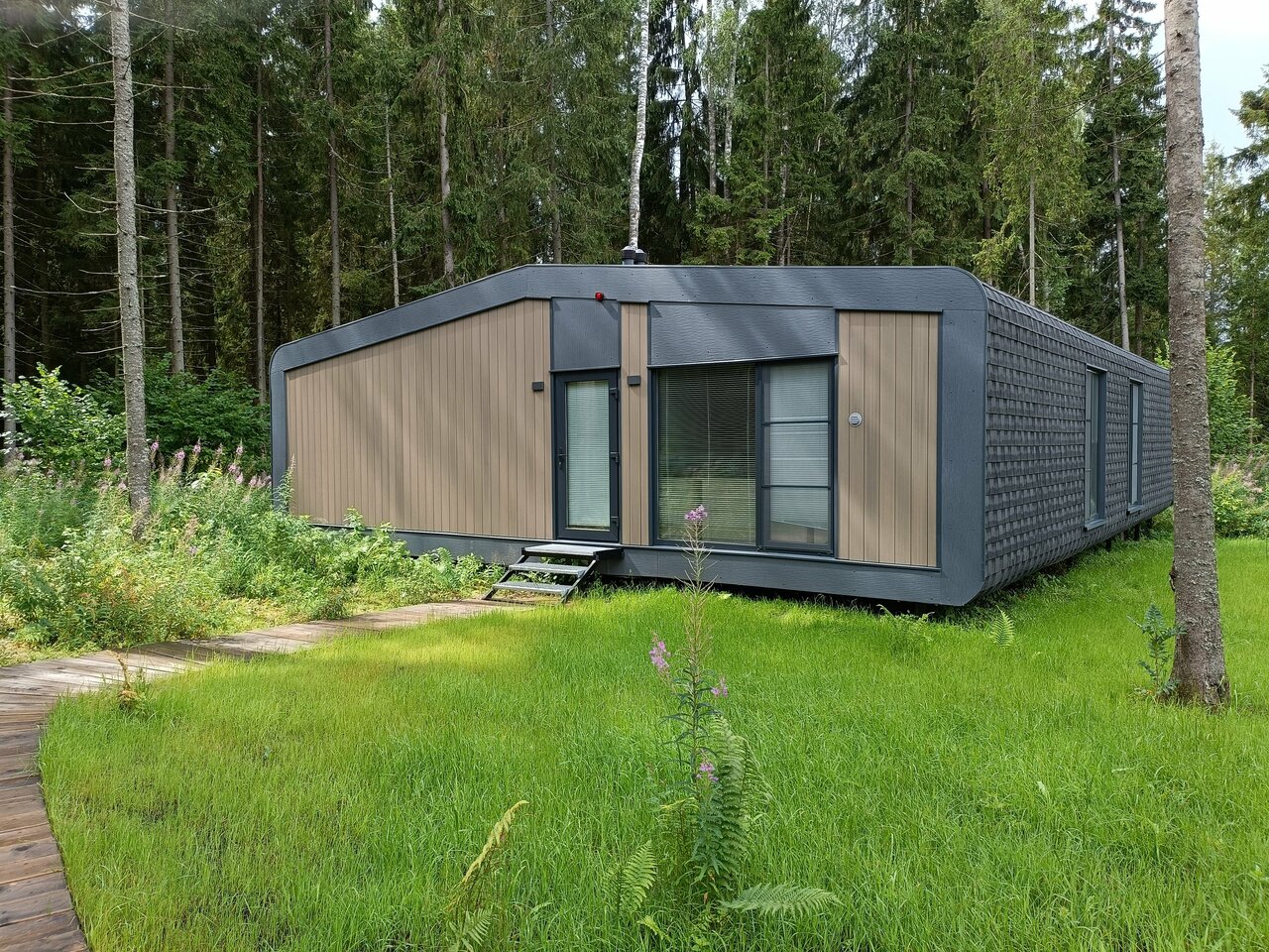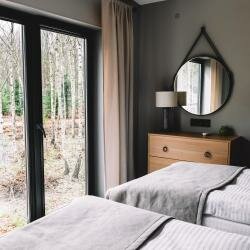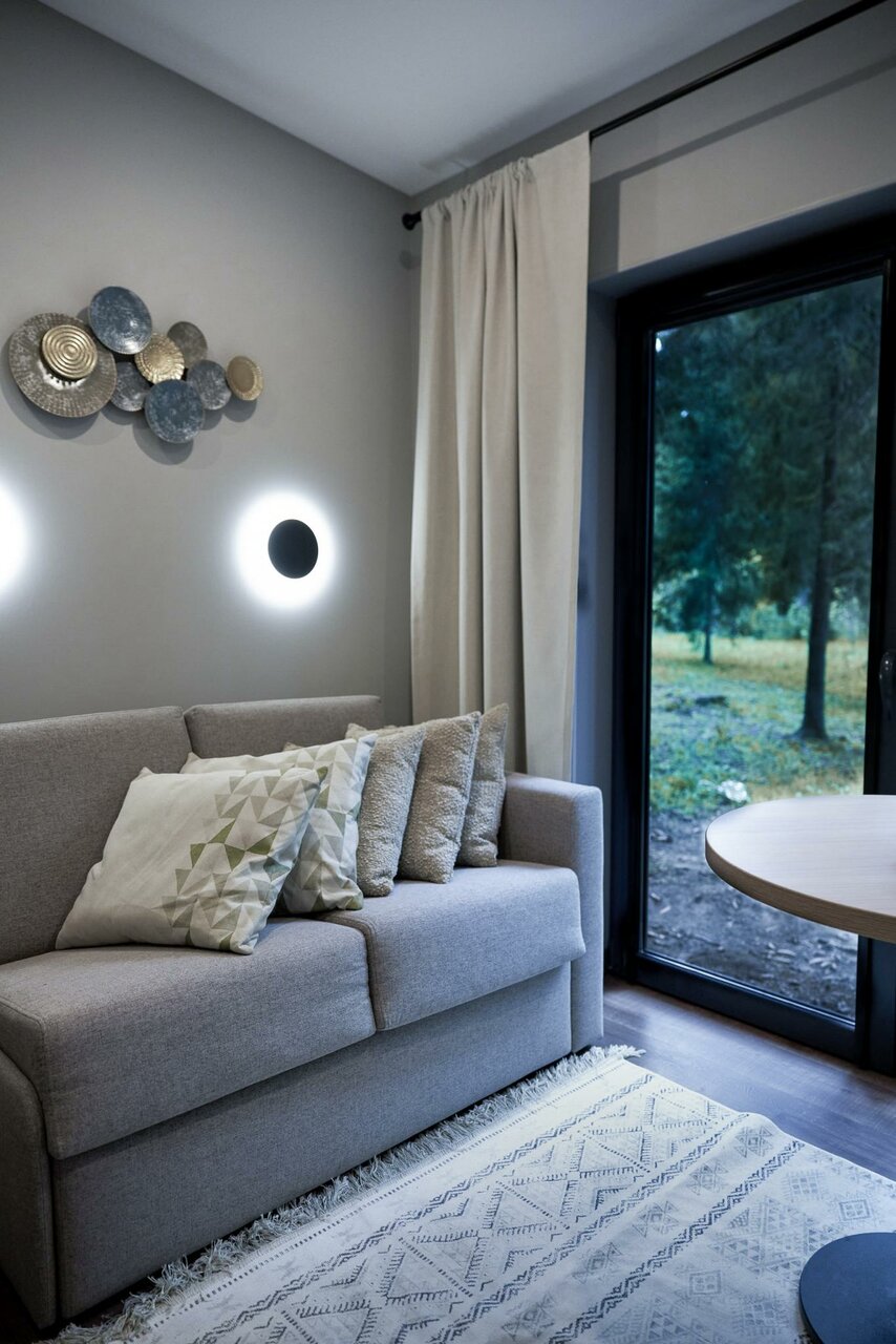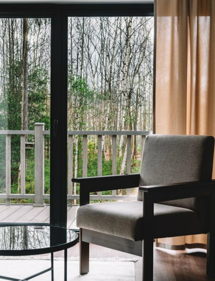 - Панорамные окна с видом на лес.
