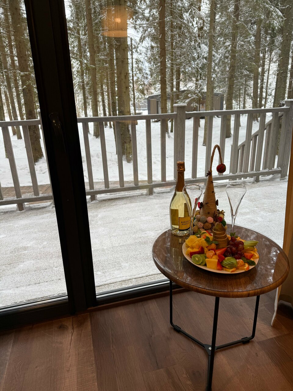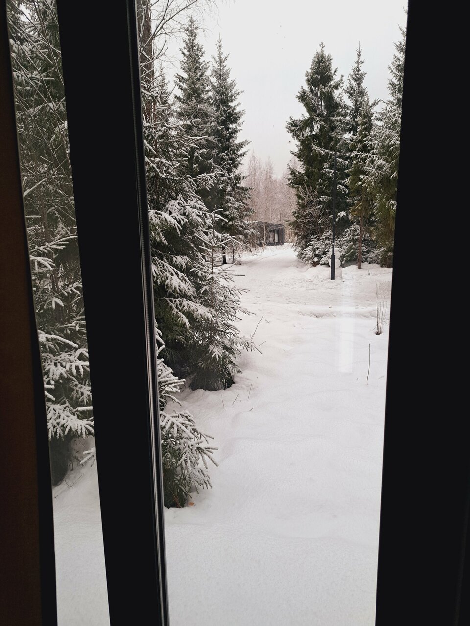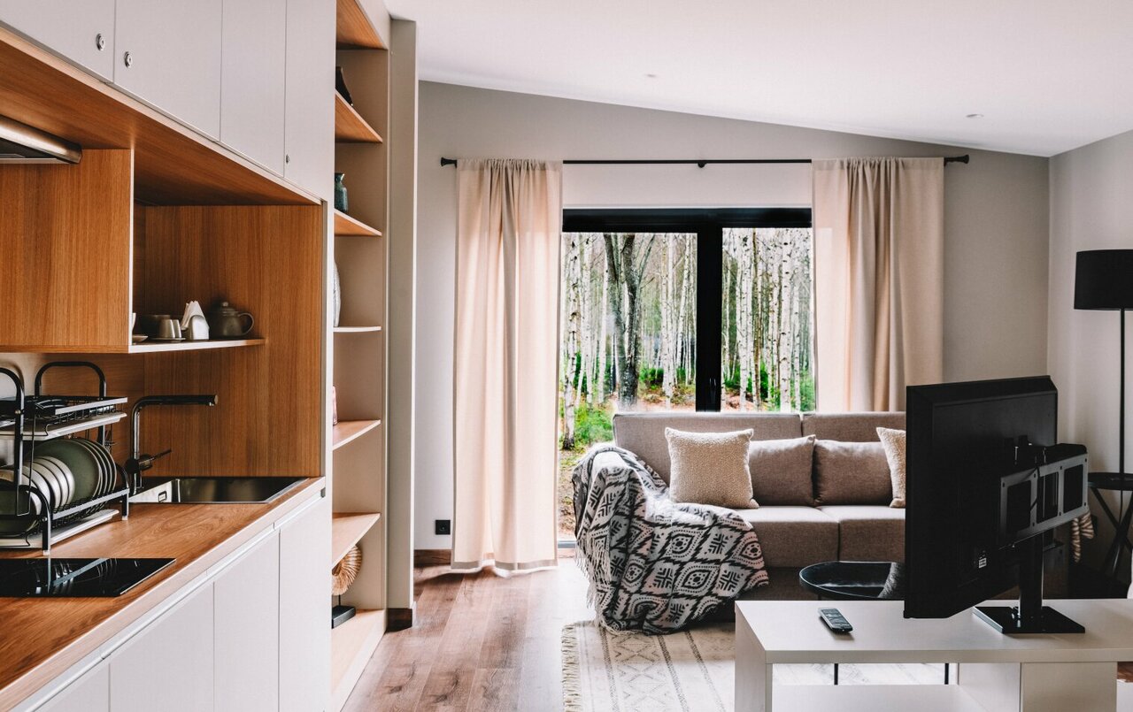 - Панорамные окна с видом на лес.