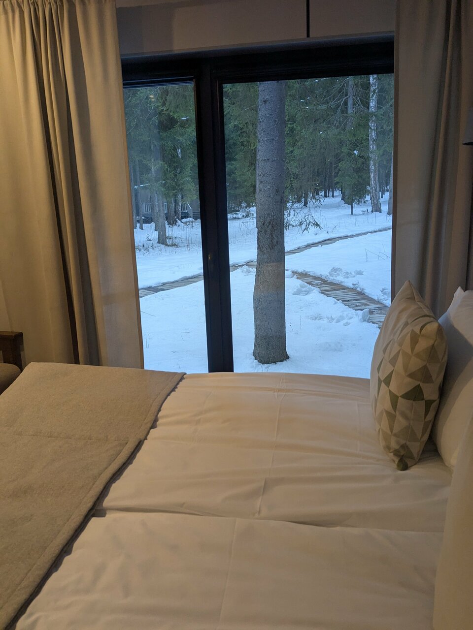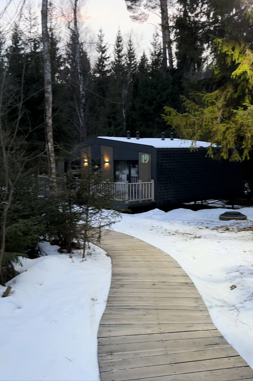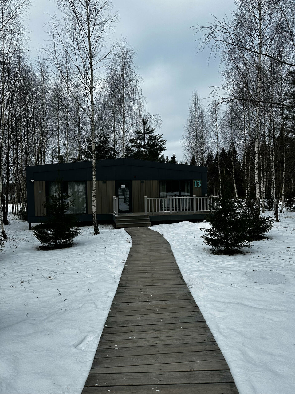 Отмечали здесь девичник, сняли отдельный домик с террасой, стоит полностью в лесу, очень круто) Отель новый, в домике классный сканди-ремонт, ничего лишнего и в то же время есть всё необходимое. Принесли по звонку дополнительные полотенца. Сотрудники вообще супер, очень приятно было общаться, клиентоориентированность на высоте. Домики стоят довольно далеко друг от друга, наша музыка ночной тусовки никому не мешала) Классный ресторан с видом на реку, вкусные салаты и горячее, пытаюсь дома повторить салат с куриной печенью, но так и не получается(
