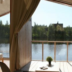 Отдыхали в домике с панорамными окнами,претензий к домикам вообще нет,чисто, уютно.Есть телевизор,микроволновка,холодильник, кондиционер.Очень порадовали одноразовые тапочки,зубная щётка,шампунь и мыло.Недалеко от дома есть мангальная зона,за мангал отдельно оплата (что очень странно и дико),могли бы тогда и дрова предоставить.Отдельно хочется сказать про рыбалку в этом месте!Люди,ехать рыбачить в это место НЕ СТОИТ.Рыбы там вообще нет,а если есть то ее кормят.В общем за сутки не поймали ни единой рыбки,так же дела обстояли у наших соседей по домику.А деньги содрали, как будто там водится золотая рыбка.