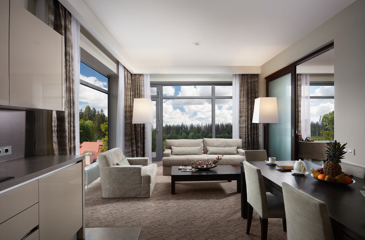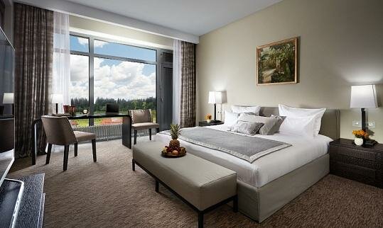 Отдыхали на выходных в этом отеле. В целом нам понравилось! 1. Номер у нас был De luxe, 2 комнаты, 2 балкона, чистый аккуратный, все туалетные принадлежности в номере были. 2. Очень вежливый приветливый персонал, всегда на связи, помогут, ответят на все вопросы. 3. Посетили бассейн, боулинг, спа, детскую комнату все было отлично. Бассейн входит в стоимость, за остальное доплачивали 4. Но есть минус! Ресторан на территории один и как мне кажется неоправданно дорогой! К примеру стейк лосося 2990, жареная картошка с белыми грибами 1200, при всем этом еда обычная, Вау эффекта не было. Например заказали чай, нам принесли заваренный пакетик в чайнике. В стоимость входил только завтрак, который заказывали накануне. Завтрак был не плох. Мы остались сыты и в целом довольны. В целом мы остались отдых нам понравился!