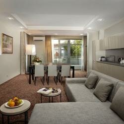 Удобства: — 2 ресторана, кафе, 2 бара — Крытый бассейн, сауна, баня, джакузи — Тренажёрный зал, спа, салон красоты — Детский клуб, игровая комната, площадка — Бесплатная парковка, велопарковка — Лифт, Wi-Fi, консьерж-сервис