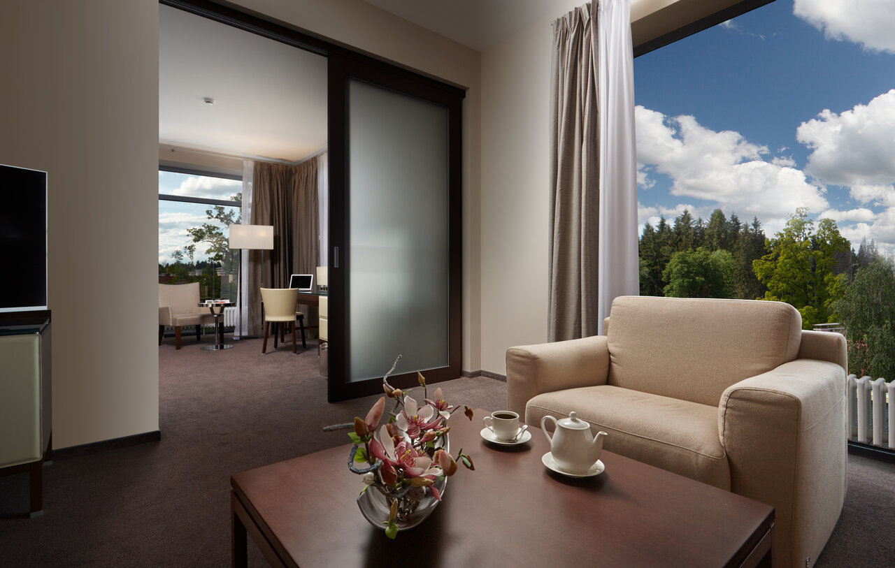 Приехали на два дня в отель. Номер хороший (взяли двухкомнатный люкс). Но ресторан/ это отдельная история!! Хотели заказать в номер сырную тарелку и попросили два пустых бокала для вина (приехали вечером поздно. Так вот, за аренду одного бокала попросили 1.000 (!!!) рублей.. сказать, что мы были в шоке- это ничего не сказать. На следующий день на обеде заказали блюда из лося и оленя. Принесли две неотличимых друг от друга подошвы, которые есть было просто невозможно. Нам пришлось заказать другие горячие блюда и на нашу просьбу исключить из счета неудавшиеся блюда нам ответили что шеф попробовал и сказал, что качество соответствует уровню ресторана. Ну что ж. Ответ говорит сам за себя. Наталия и Олег