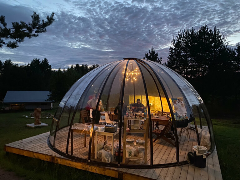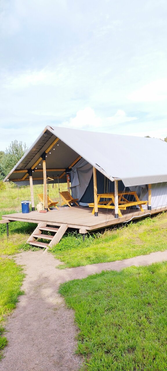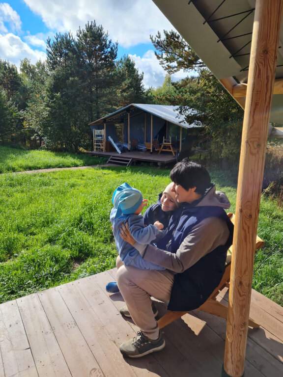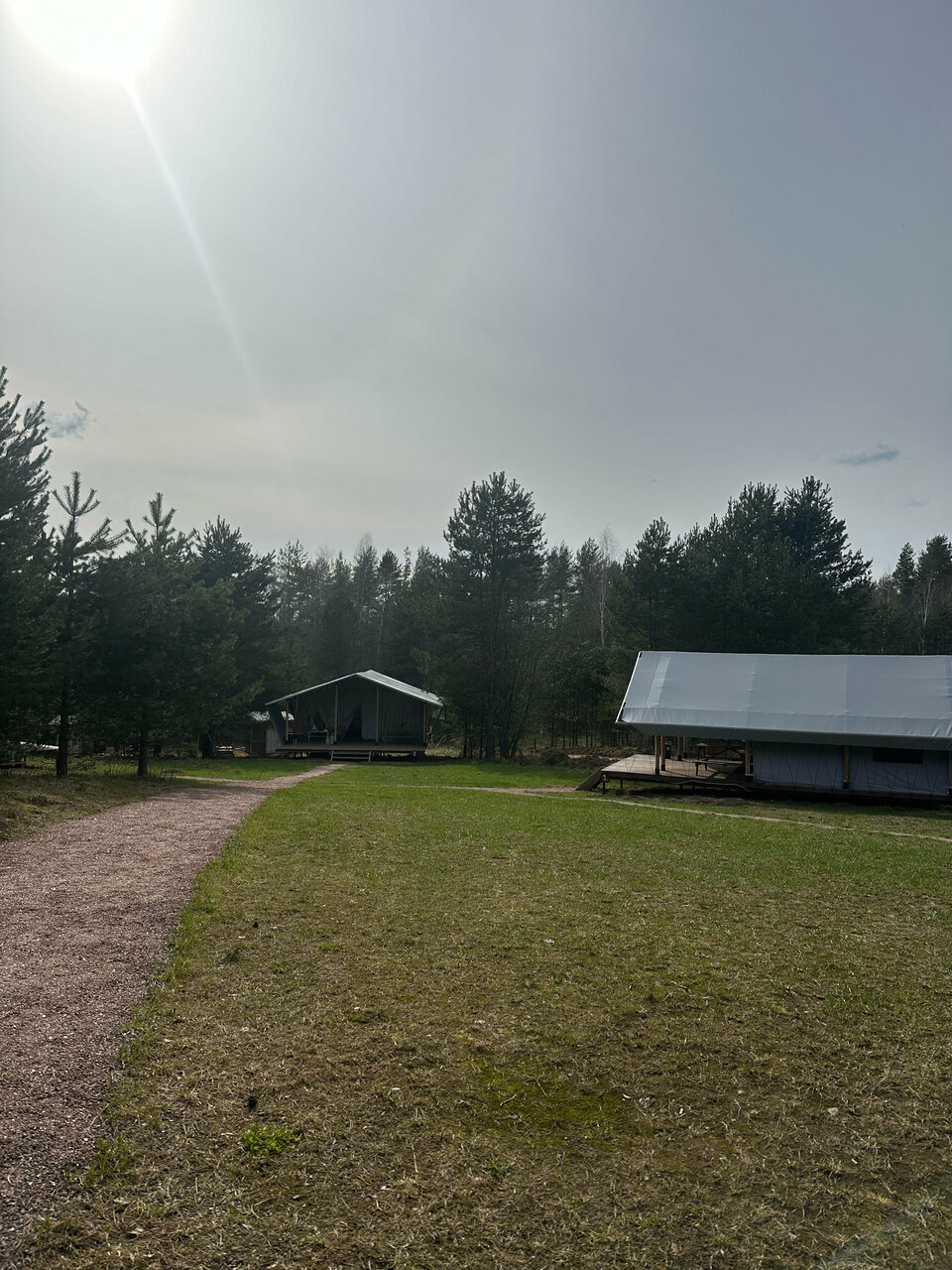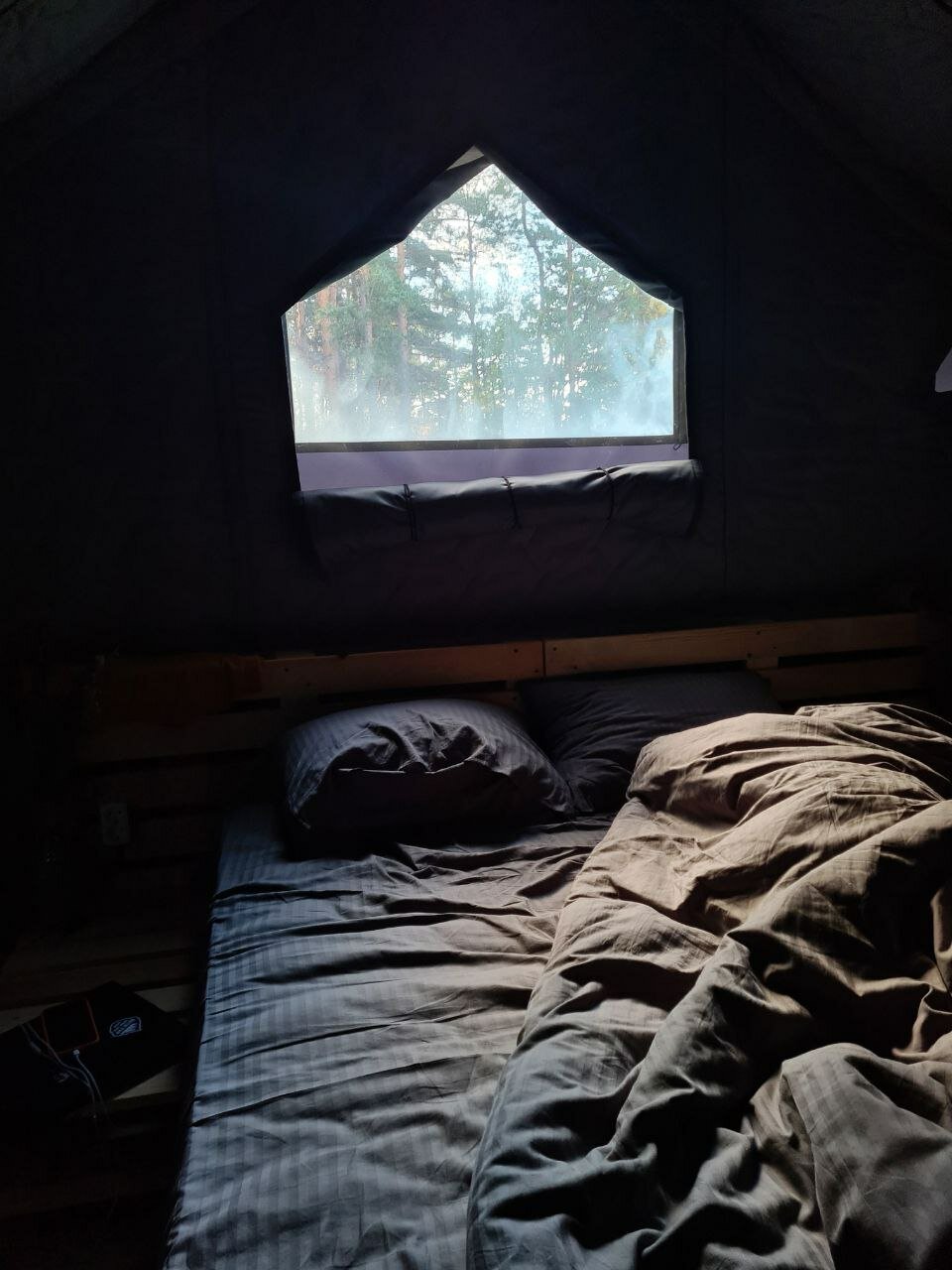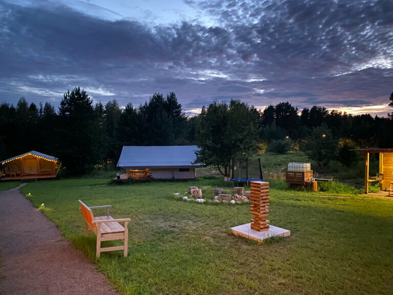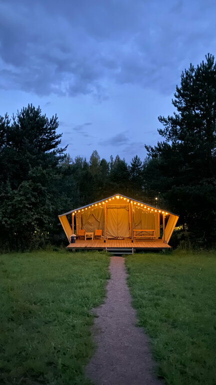 Тихое, уютное место. Снимали семейный тент-хаус. Всё чисто, свежая постель, полотенца. Есть мини-печка для приготовления завтраков, теплые полы, можно под себя отрегулировать температуру. В отдельном домике 3 туалетных комнаты с душем, с горячей водой. Есть настольные игры, батут и многое другое. Красивая территория! Понравилось!