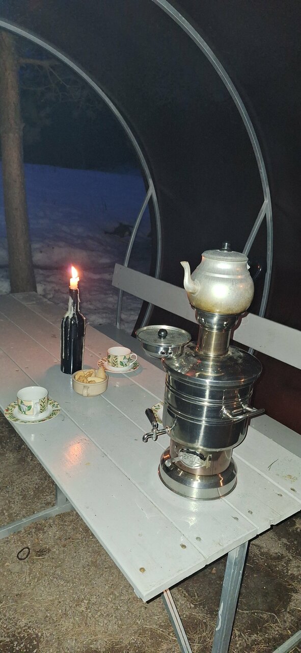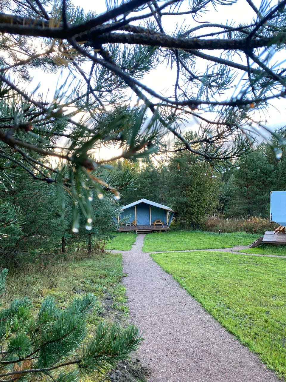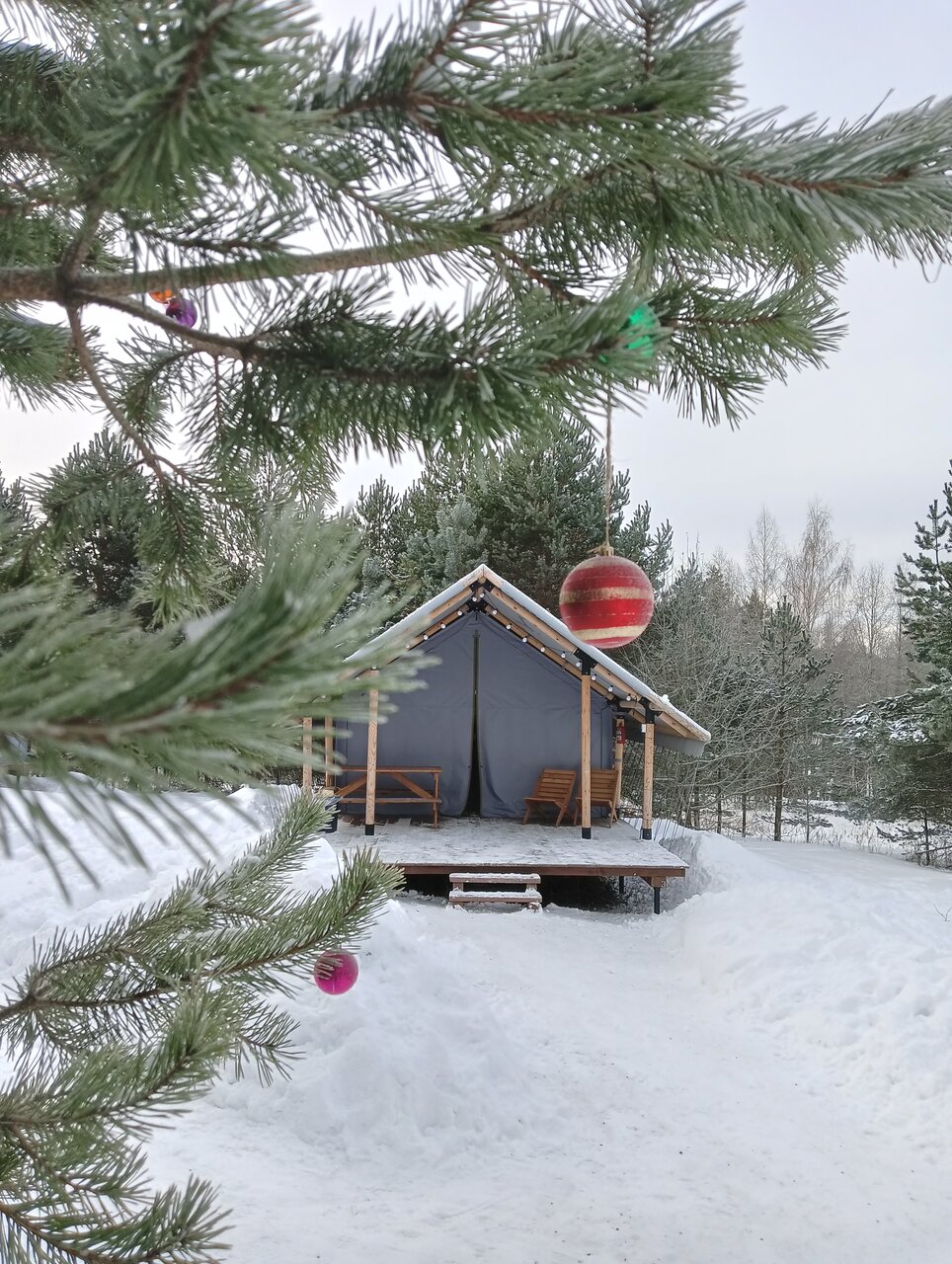 Очень милое место с немногочисленным, доброжелательным персоналом. Снимали фемнли-рум: теплый, комфортный , продуманный. Правда, пришлось повозиться, что бы закрыть окна. Но мы в палатках впервые. Баня просто прекрасна, особенно теплая купель ( похожая на большой котел, род которым горит огонь). Даже дождик не испортил банных удовольствий. Для любителей уединения хорошее место.