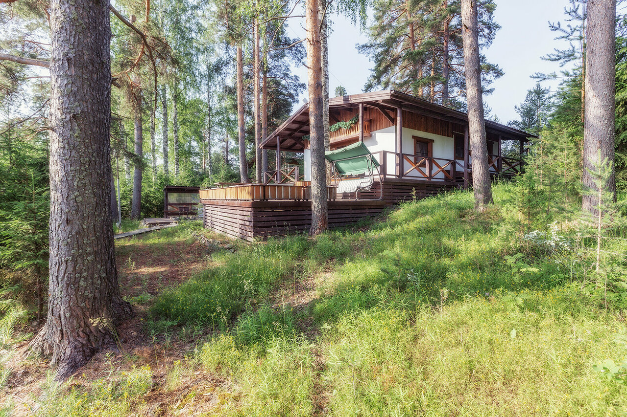 Уютный, полностью благоустроенный коттедж выполнен в скандинавском стиле, расположен на берегу Кончезера (до озера 10 метров).Вместимость - 8 человек