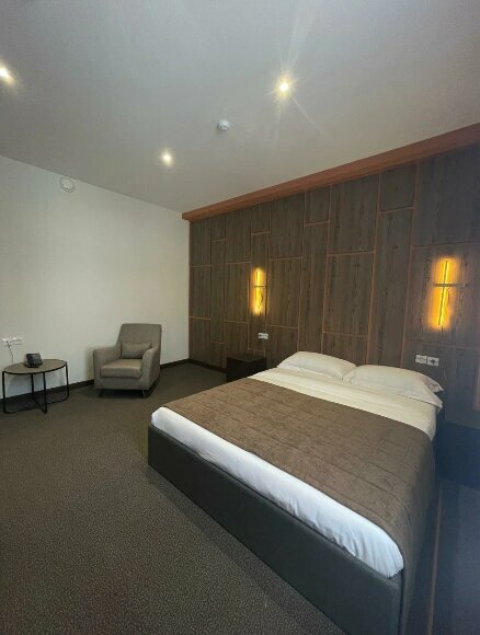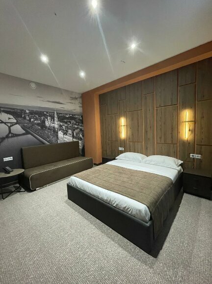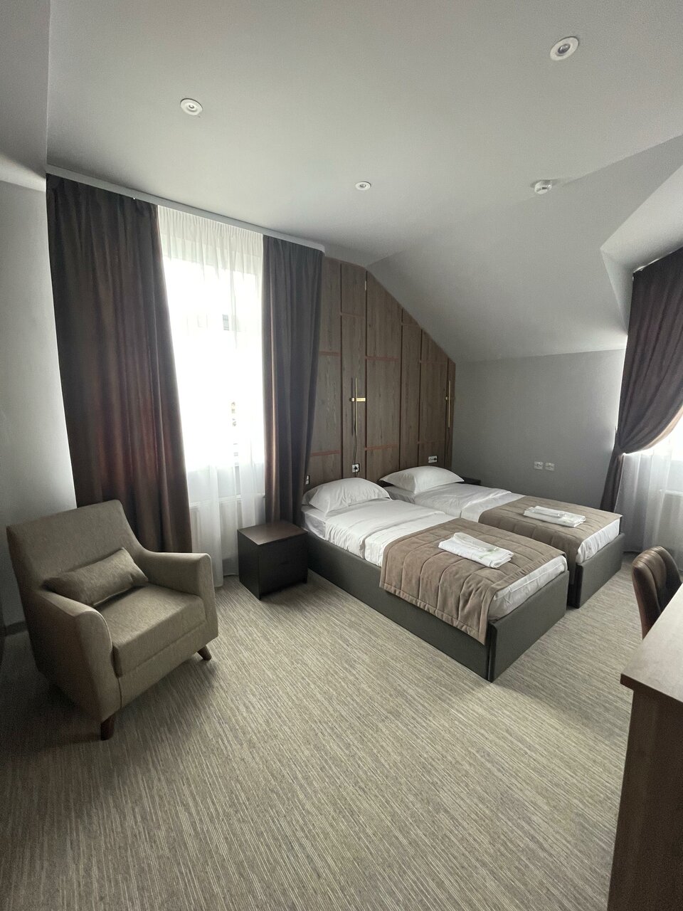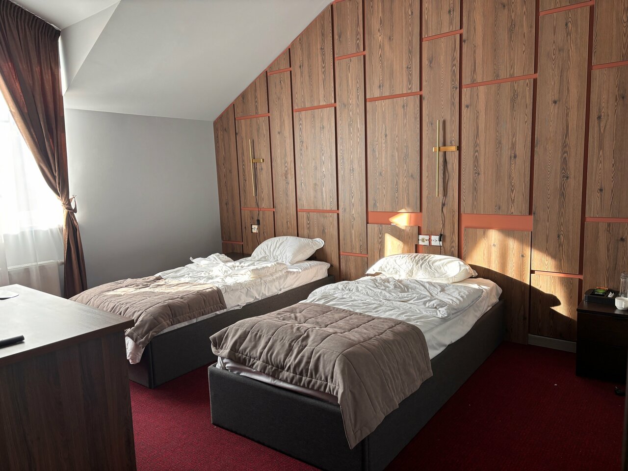 В целом гостиница неплохая, видно, что новая, внутри чисто и аккуратно. Брали 2 номера один нам дали на 1 этаже, второй на 2. Из минусов — на втором этаже из горячего крана течёт холодная вода, причём выезжали люди из другого номера тоже высказали по этому поводу, на первом этаже чуть тёплая. В номере холодно, я конечно понимаю, что на следующий день должно было быть тепло, но ночью было около 0, батареи чуть тёплые большой номер не прогревали. Нет корзин для мусора, при входе в номер неплохо было бы добавить хотя бы обувницу и вешалку, а также ложку для обуви. Первый раз увидела в гостинице отсутсвие мини-холодильника. Завтрак средне, выбор не очень большой. Слышимость соседей отдельный разговор, слышен был храп соседа, а когда они разговаривали было ощущение, что находятся с нами в одном номере.