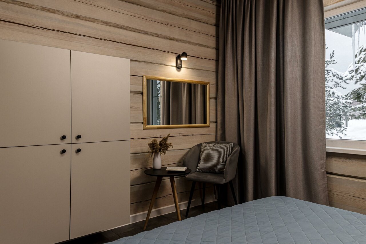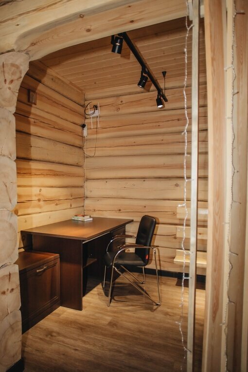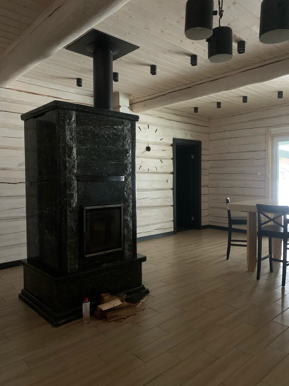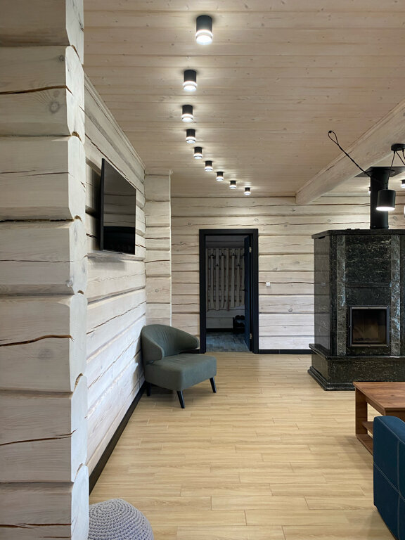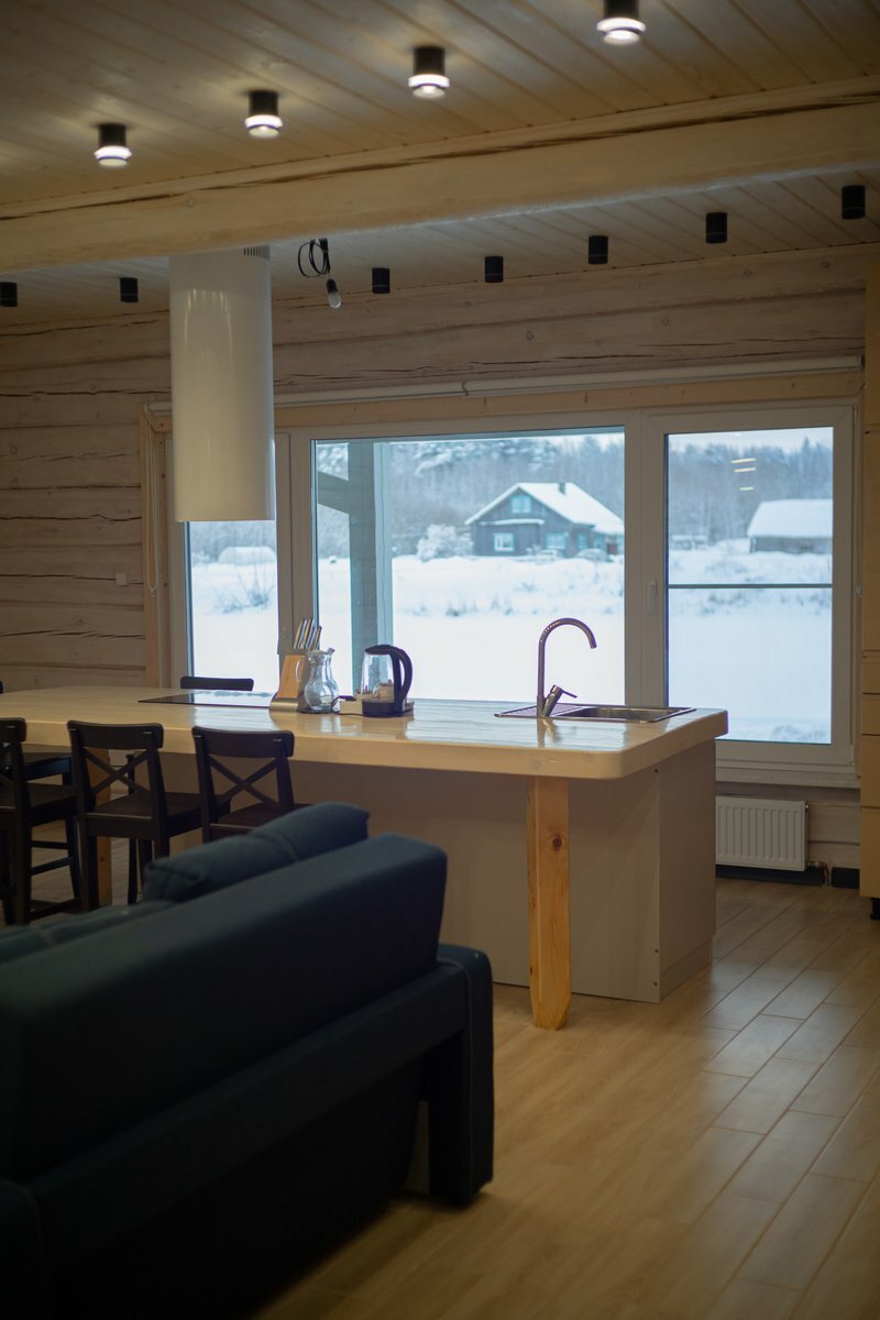 Дома из бруса с красивым интерьером, больше всего нам понравилась большая кухня-гостиная с кухонным островом, мы собирались вечерами всей компанией в 10 человек вокруг него, ужинали и смотрели в панорамное окно. Также понравился камин все в той же гостиной.