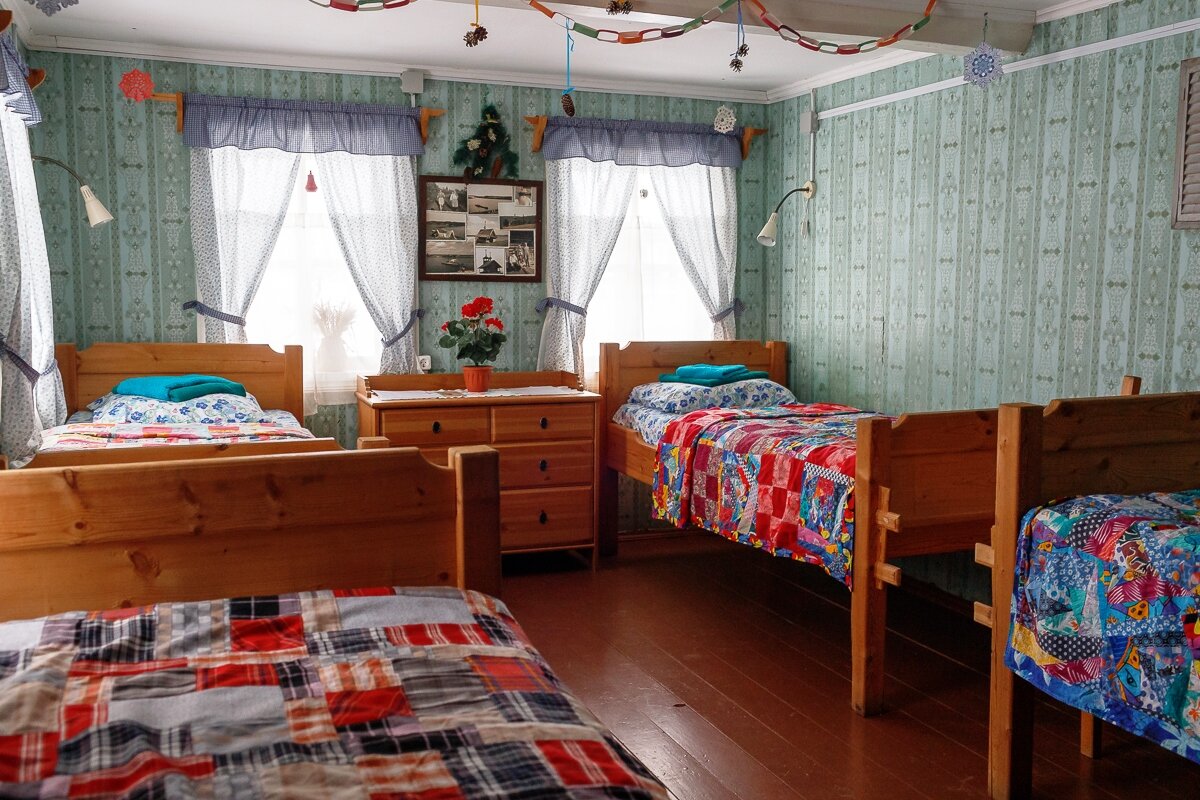 Тесные комнатушки в бревенчатом доме, туалет общий, пахнет соответственно уличному туалету, во дворе есть баня, столик на улице и вид на озеро. Топят дровами, воды как таковой кроме как из озера нет, местные ее пьют и готовят с неё, она коричневого цвета. Магазин в 300 метрах. Экзотика севера, панимашь.