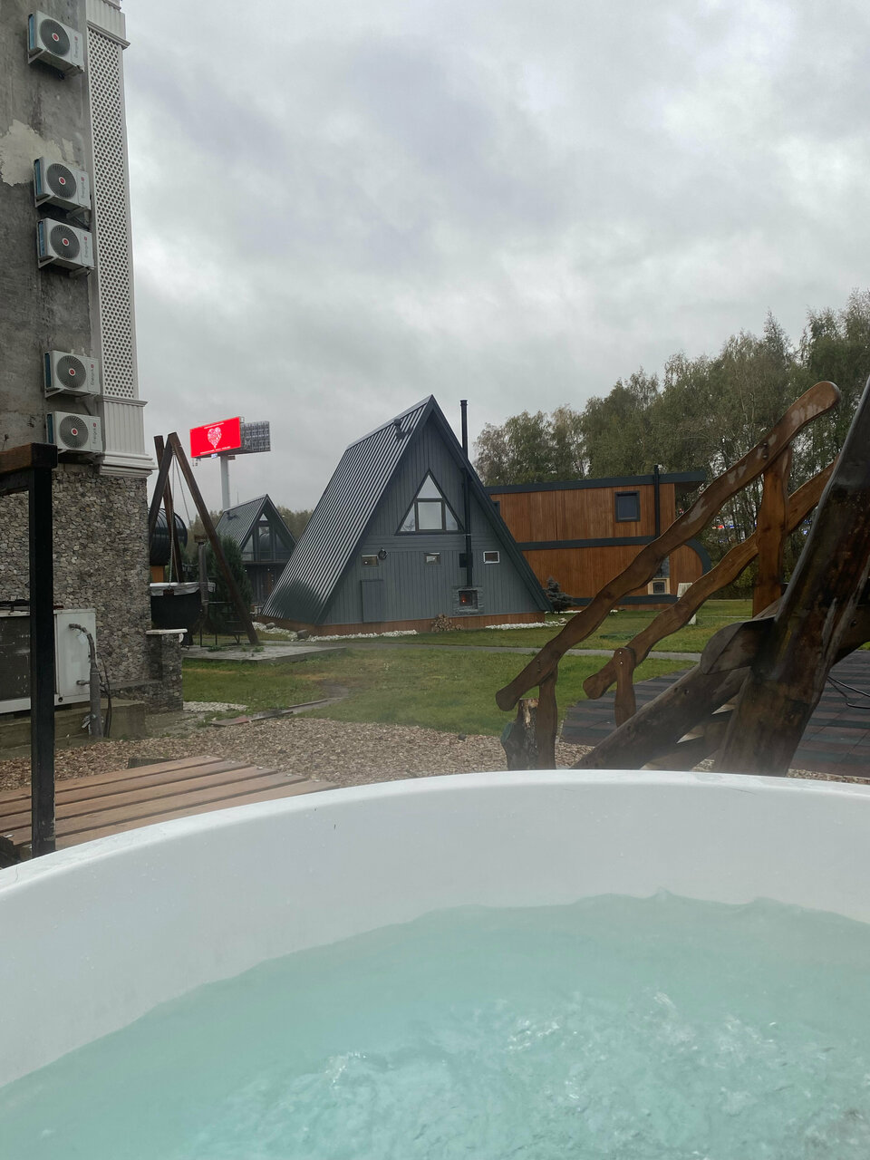 Немного странное место — в непосредственной близости от шоссе на Домодедово, рядом с заправкой и макдональдсом… Но внутри в меру помпезные номера, есть маленький уютный бассейн с сауной/хамамом, и можно даже посидеть в бочке с кипятком во дворе с видом на трассу.