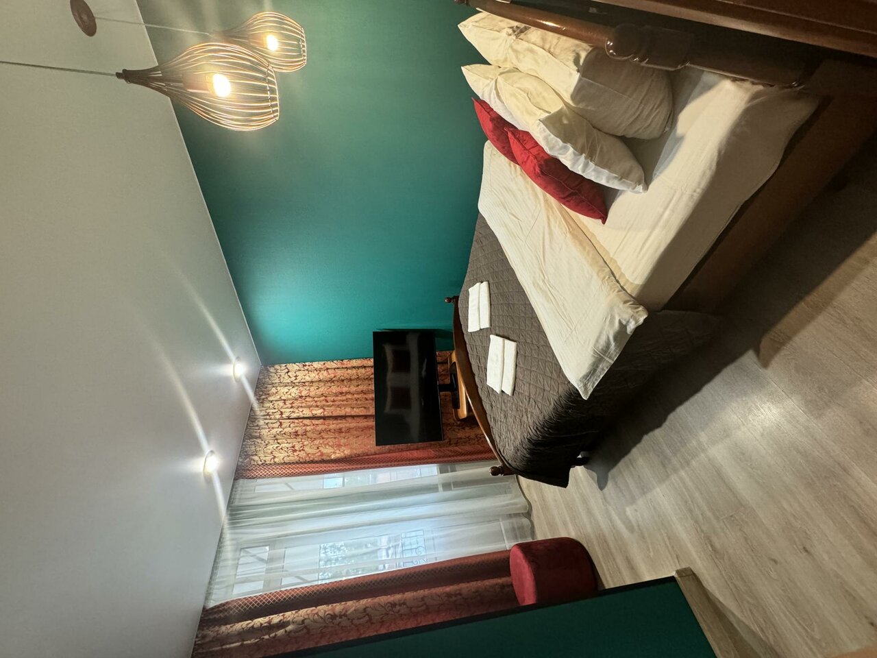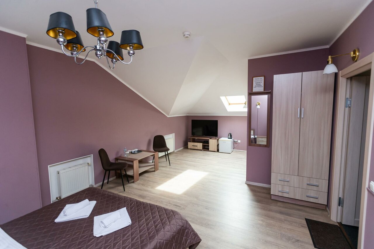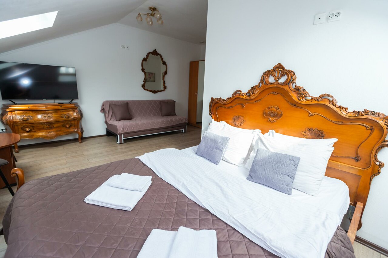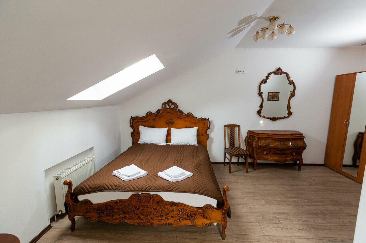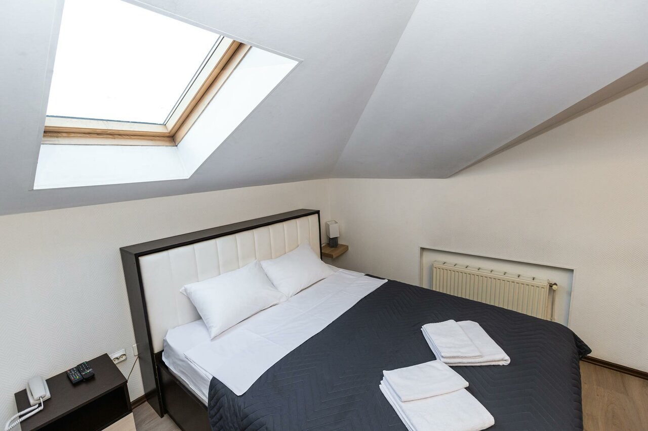 Мансардный люкс с одной большой кроватью,сан узлом с ванной и душевой кабиной.