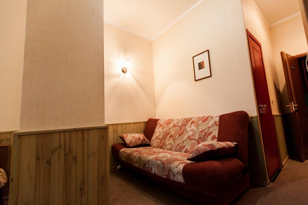 Улучшенный номер с двумя односпальными/одной двуспальной кроватью. Дополнительно в номере размещен раскладной диван на 1/2 человека. Максимально - вмещает 4 человека.