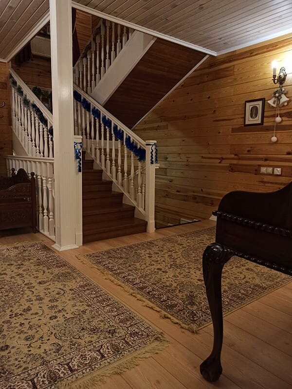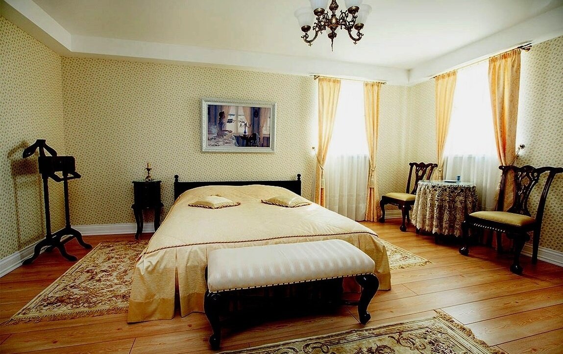 Роскошный отель на берегу озера, на другом берегу которого находится усадьба Михайловское. Великолепно воссоздана атмосфера дворянского быта того времени. Уютно. Колоритно. Дружелюбно. Из минусов: так как это дом, а не отель — слышимость соседей. И не впечатлила еда.