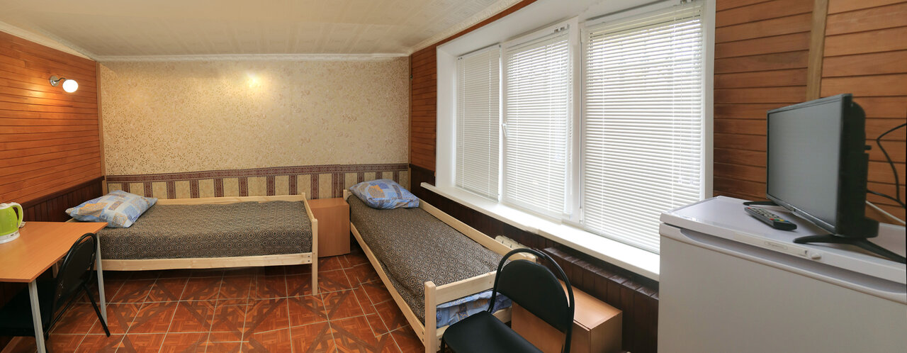 Персонал на пять, в комнатпх двухярусные кровати, чем то напоминают армейские, но не во всех. Отсутствуют сплитсистемы и вентиляторы. Если на улице 25 градусов в комнате очень душно не спосают даже открытые окна. Цена койкоместа очень дорогая. С нас брали 1230 без разницы двухместный номер с удобствами или пятиместный