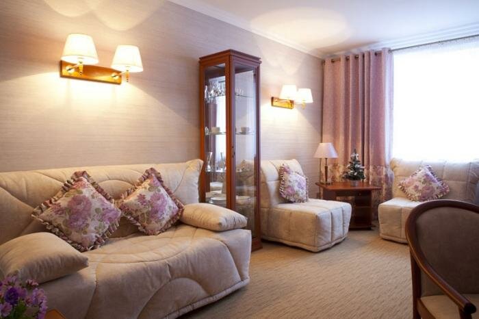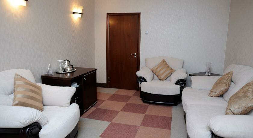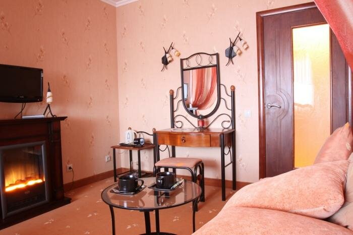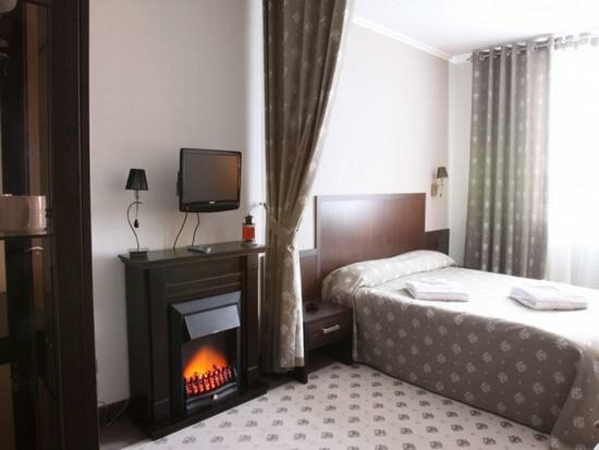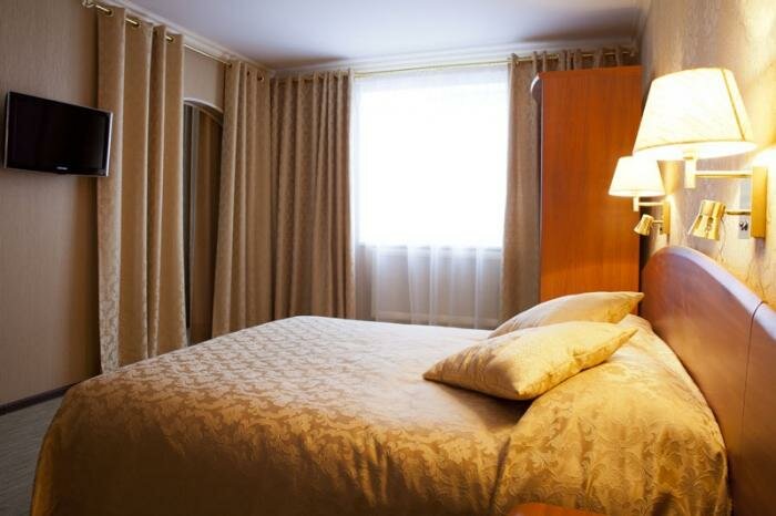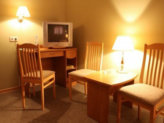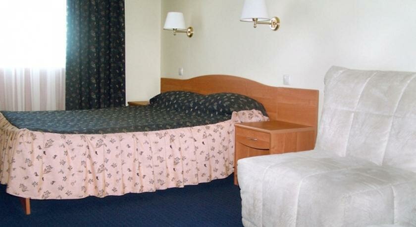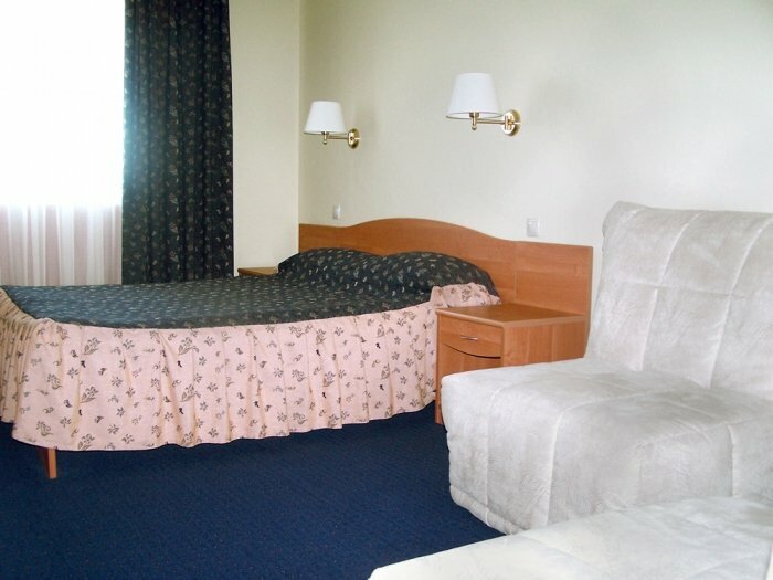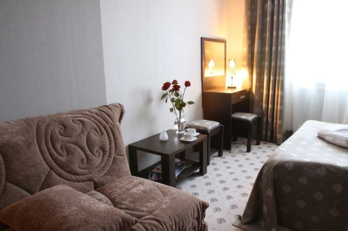 Гостиница уставшая. Пора бы сделать ремонт и обновить мебель. Чайник в номере есть, а чая нет. А если не предераться, то переночевать можно.