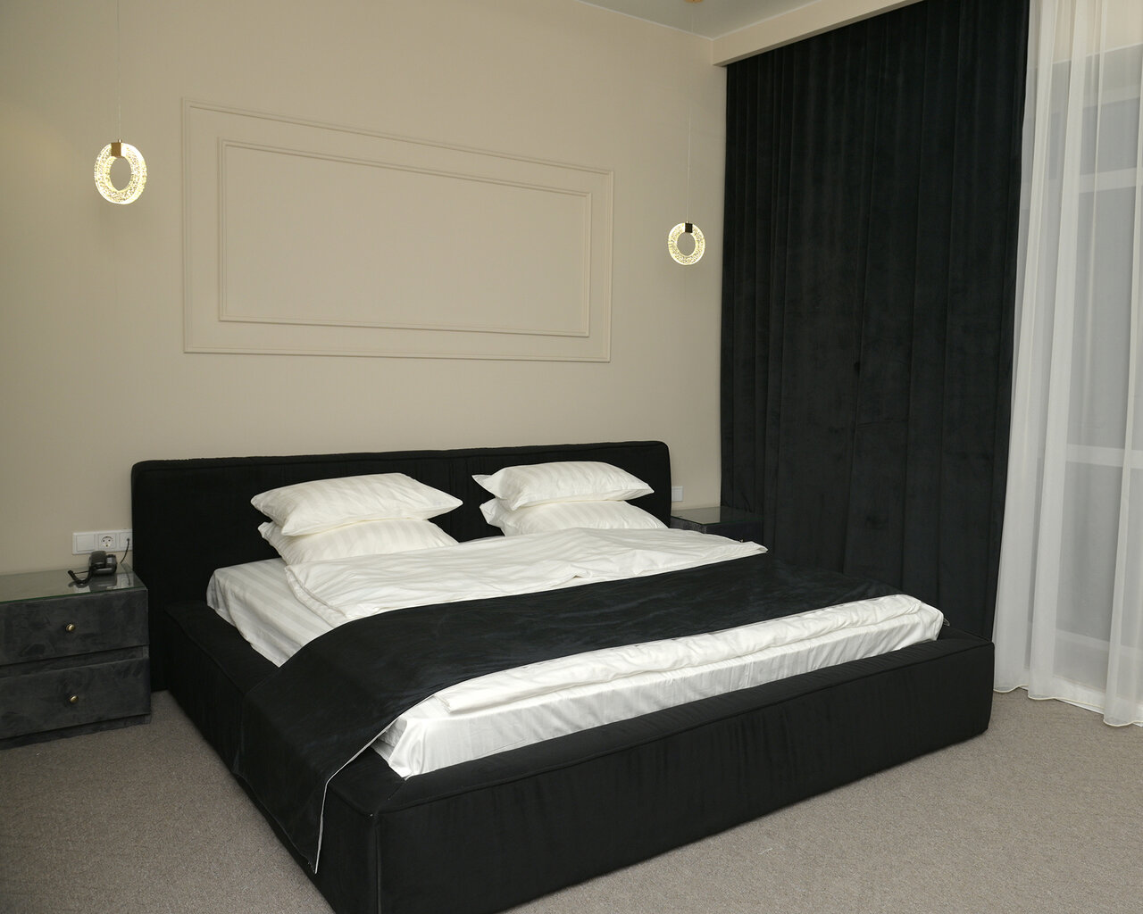Просторные номера предлагают достаточно места для отдыха. В номере есть удобная двуспальная кровать, уютные подушки и одеяло для комфортного сна, махровые халаты, шкаф для гардероба, телевизор, кондиционер, фен, туалетные принадлежности и чайный набо