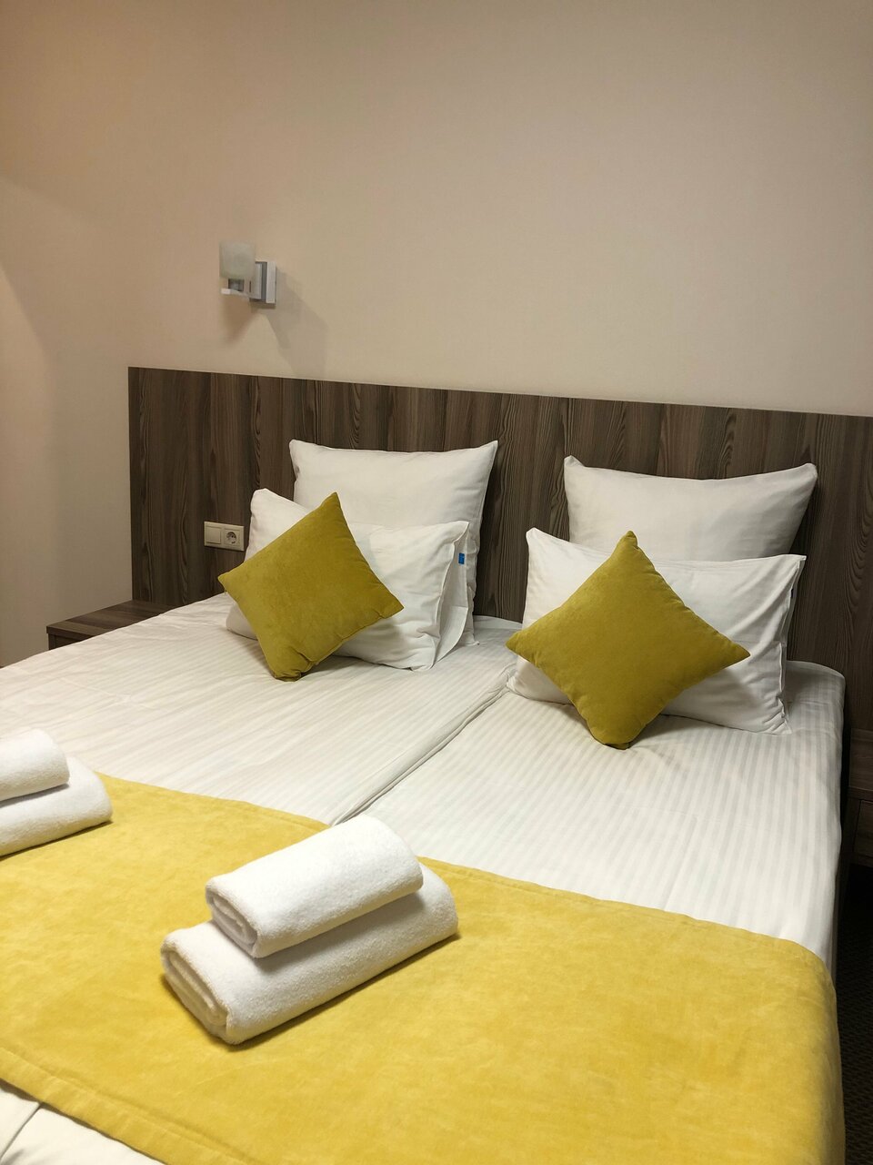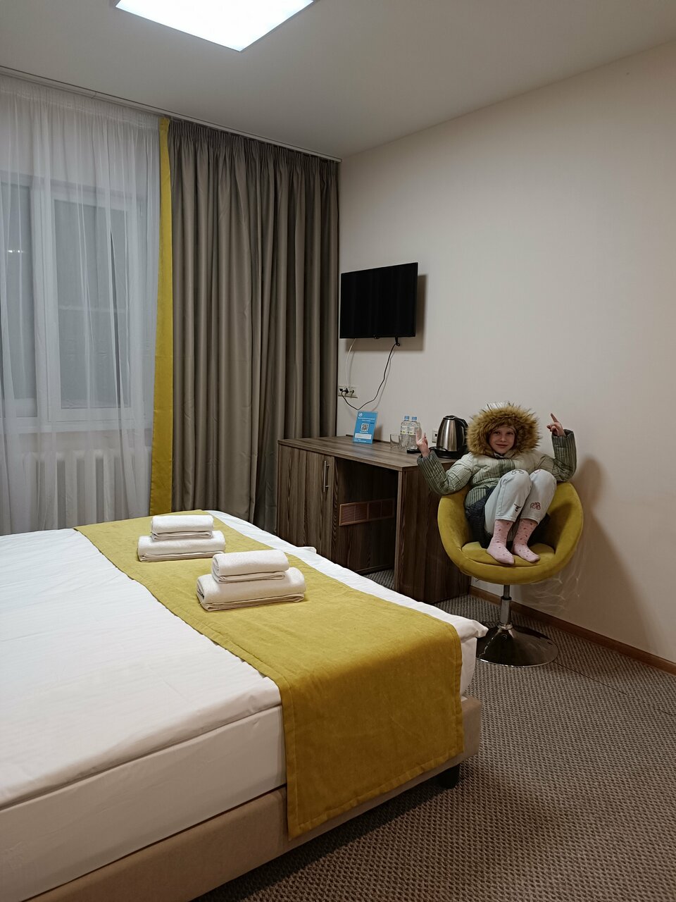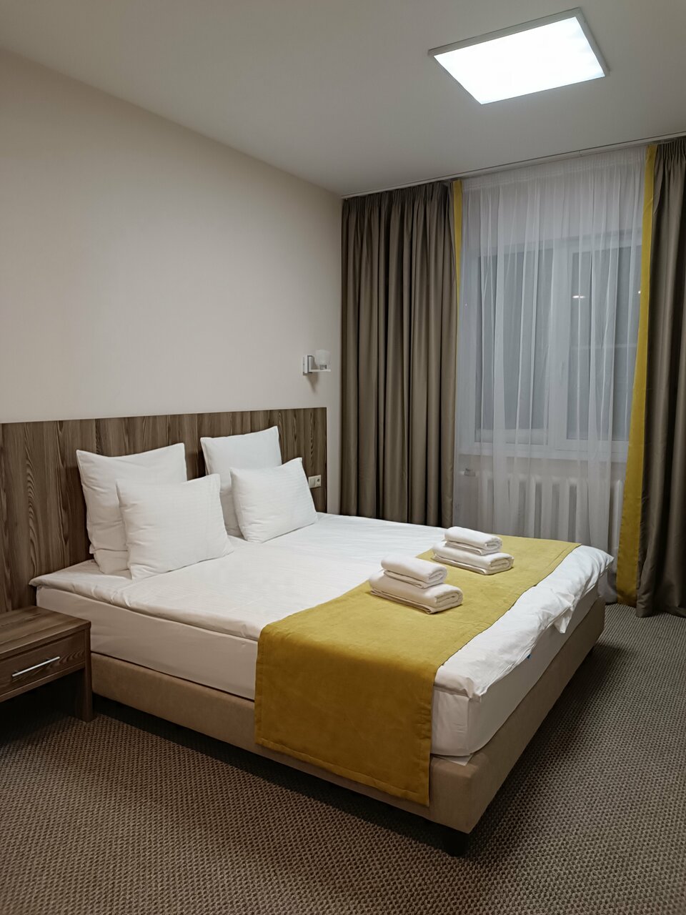 Останавливались в отеле на одну ночь по дороге домой с отдыха. Отель отличный, чистый, номера в современном стиле. Кровать и постельное бельё это ещё один огромный плюс! Чистое белоснежное бельё, два варианта подушек, удобный матрас. Спали словно на облачке, как дома, а дома у нас отличная кровать с качественным матрасом. В номере есть тапочки, сейф, фен, ложечка для обуви, две бутылочки воды по 0,5 литра. Есть мини -холодильник, но нам не понадобился. Белоснежные полотенца, так же есть отдельно для ног после душа. Парковка большая, это очень порадовало! Нас поселили в 6 корпус на 1 этаж. Карточная электронная система ключей. Очень поравился отель, рекомендую! Спасибо всем сотрудникам, кто принимает участие в обслуживании отеля. Плохие отзывы пишут обиженные жизнью люди.