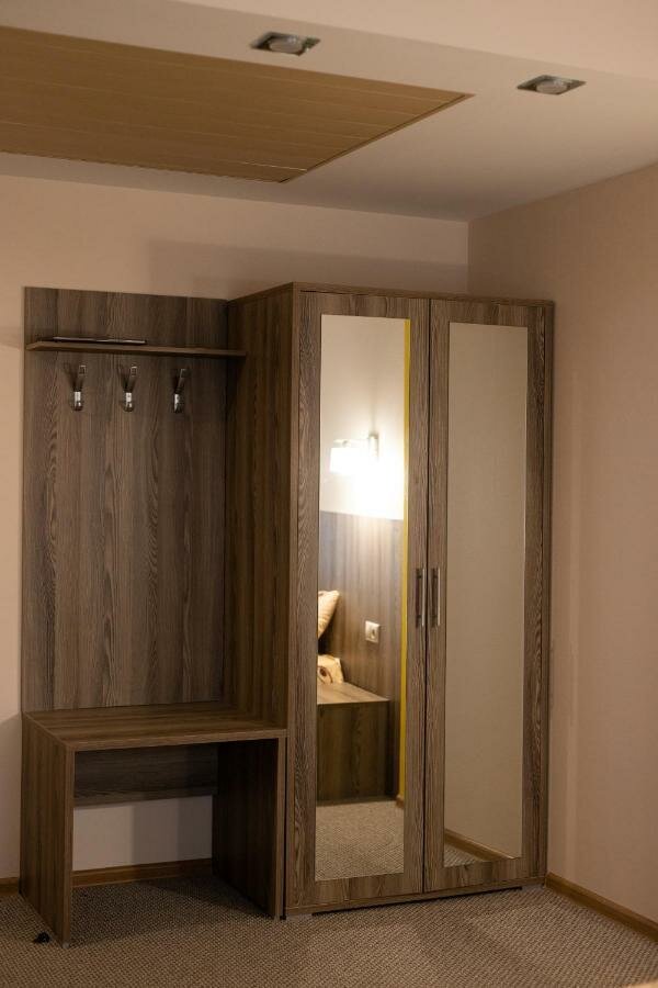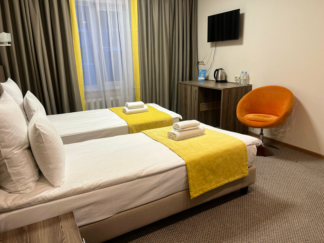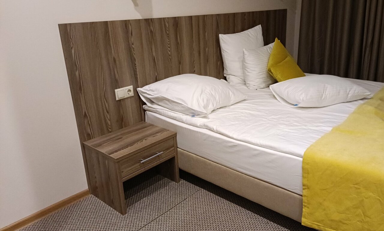 Останавливались в отеле на одну ночь по дороге домой с отдыха. Отель отличный, чистый, номера в современном стиле. Кровать и постельное бельё это ещё один огромный плюс! Чистое белоснежное бельё, два варианта подушек, удобный матрас. Спали словно на облачке, как дома, а дома у нас отличная кровать с качественным матрасом. В номере есть тапочки, сейф, фен, ложечка для обуви, две бутылочки воды по 0,5 литра. Есть мини -холодильник, но нам не понадобился. Белоснежные полотенца, так же есть отдельно для ног после душа. Парковка большая, это очень порадовало! Нас поселили в 6 корпус на 1 этаж. Карточная электронная система ключей. Очень поравился отель, рекомендую! Спасибо всем сотрудникам, кто принимает участие в обслуживании отеля. Плохие отзывы пишут обиженные жизнью люди.