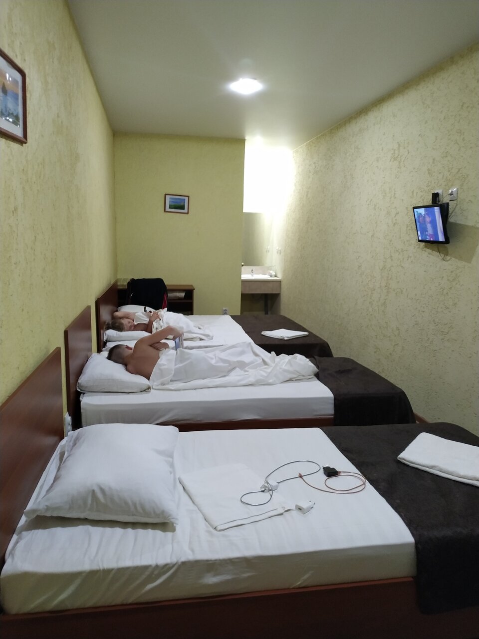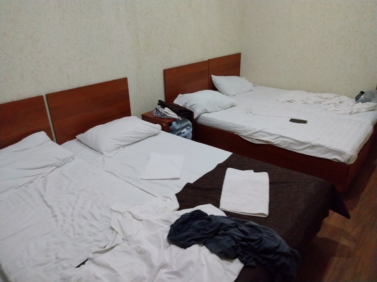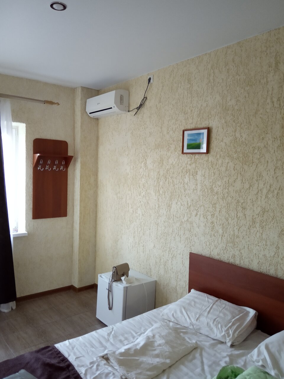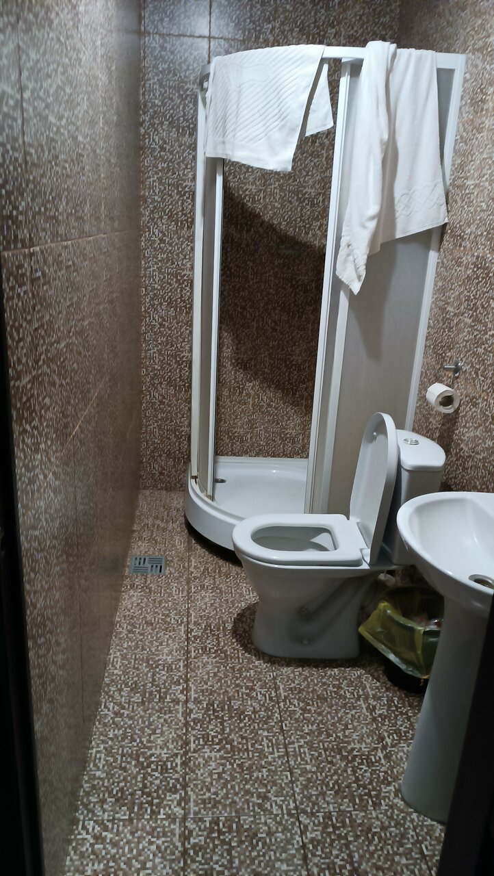 Были в гостинице 11 сентября с 22.00 ч, примерно. До 8.00 ч. утра 12 сентября. Бронировали 3-х местный номер. 1) очень мало света в комнате. Можно заменить лампочки. 2) на 3 человека один стул в комнате. 3) в ванной нет никакого коврика. Помылась и голыми ногами на плитке стоишь. 4) Прикроватных ковриков тоже нет. А полы выложены плиткой. Холодные. 5) холодильник шумный, грязный. (см.фото) 6) стол даже не вытерли. До нас видимо что то пролили на него, что то липкое.(,см.фото) 7) матрасы неудобные, проваливаешься в него. 8) кондиционер так и не смогли включить, То ли батарейки сели в пульте, то ли он вообще не работал. Не стали ходить что то требовать, т.к. очень устали с дороги, сутки не спали.