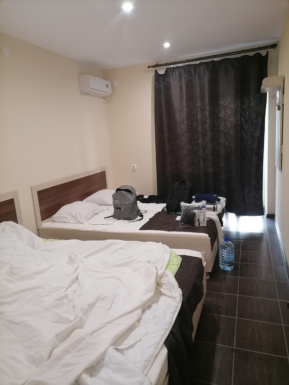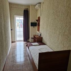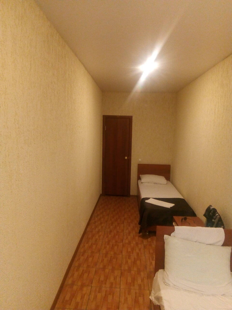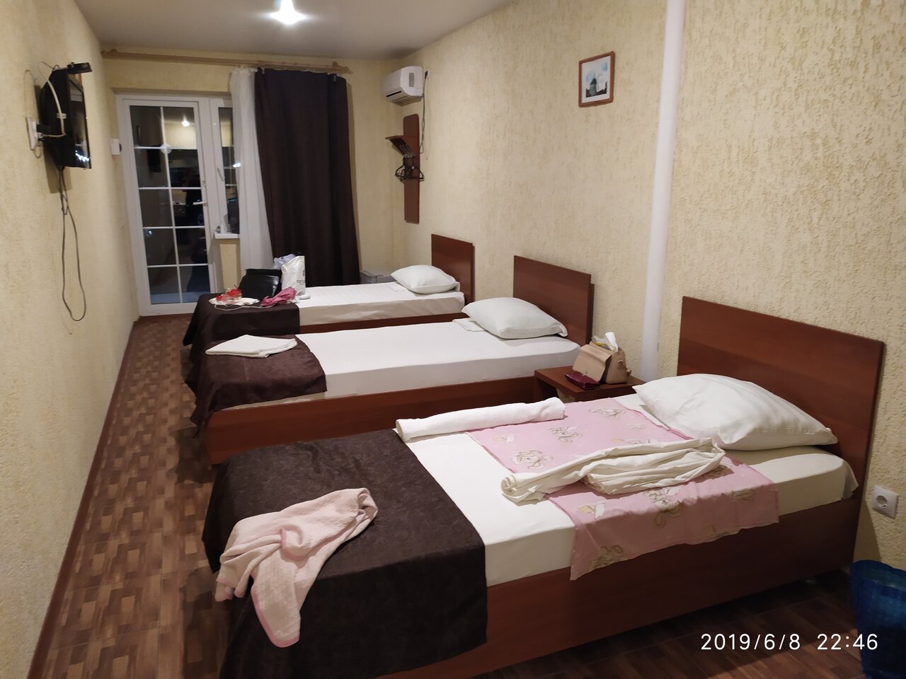 Были в гостинице 11 сентября с 22.00 ч, примерно. До 8.00 ч. утра 12 сентября. Бронировали 3-х местный номер. 1) очень мало света в комнате. Можно заменить лампочки. 2) на 3 человека один стул в комнате. 3) в ванной нет никакого коврика. Помылась и голыми ногами на плитке стоишь. 4) Прикроватных ковриков тоже нет. А полы выложены плиткой. Холодные. 5) холодильник шумный, грязный. (см.фото) 6) стол даже не вытерли. До нас видимо что то пролили на него, что то липкое.(,см.фото) 7) матрасы неудобные, проваливаешься в него. 8) кондиционер так и не смогли включить, То ли батарейки сели в пульте, то ли он вообще не работал. Не стали ходить что то требовать, т.к. очень устали с дороги, сутки не спали.