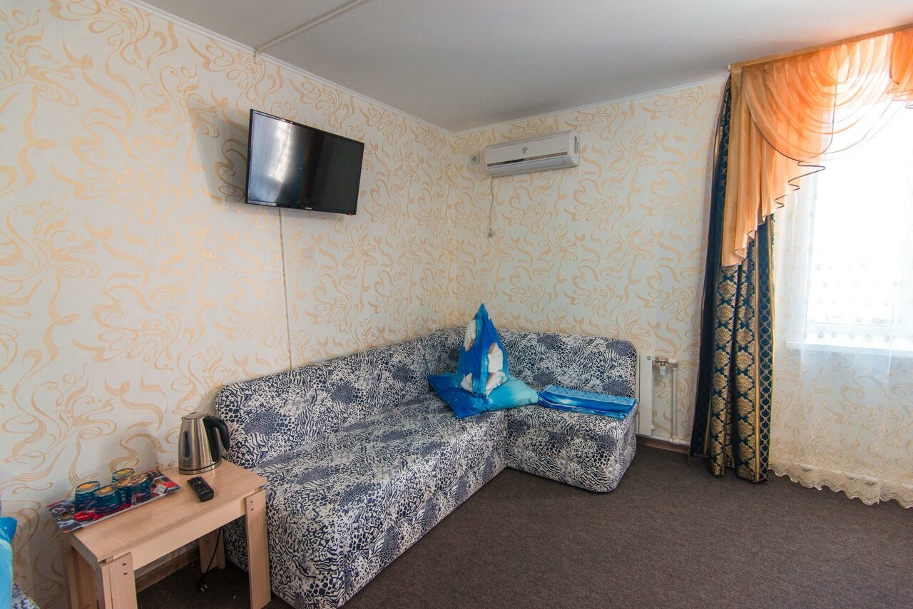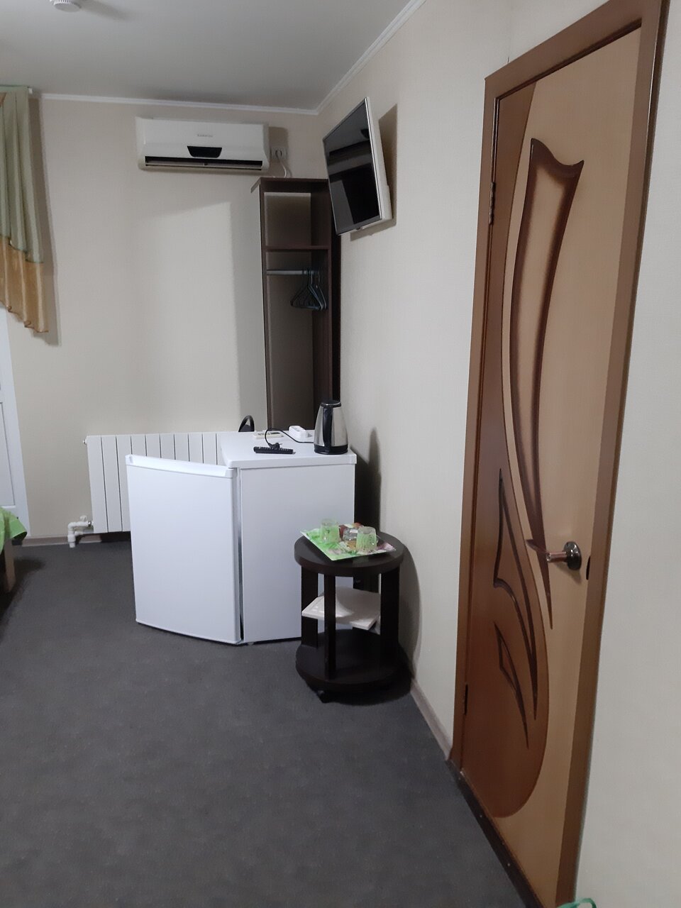 Хорошая, чистая гостиница. В номере есть чайник, кондиционер, телевизор, сетки от Комаров на окнах, шампунь, гели для душа. Есть постирочная, утюг. На первом этаже в Холле есть аппарат с кофе, холодильники с напитками, столовая где можно поесть. Ближайший магазин находится в 1,5 км, но у администратора есть контакты и меню местной шашлычной. Заказали по приезду шашлык, овощи и хачапури, было вкусно, рекомендую