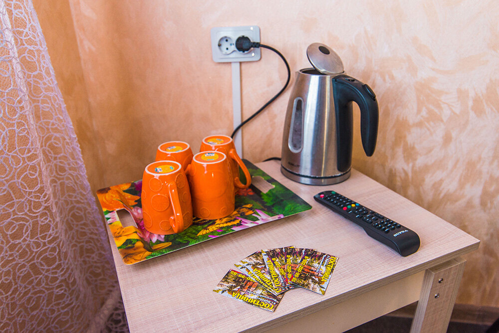 - В номере есть чайник, кондиционер, телевизор, москитные сетки, шампунь, гель