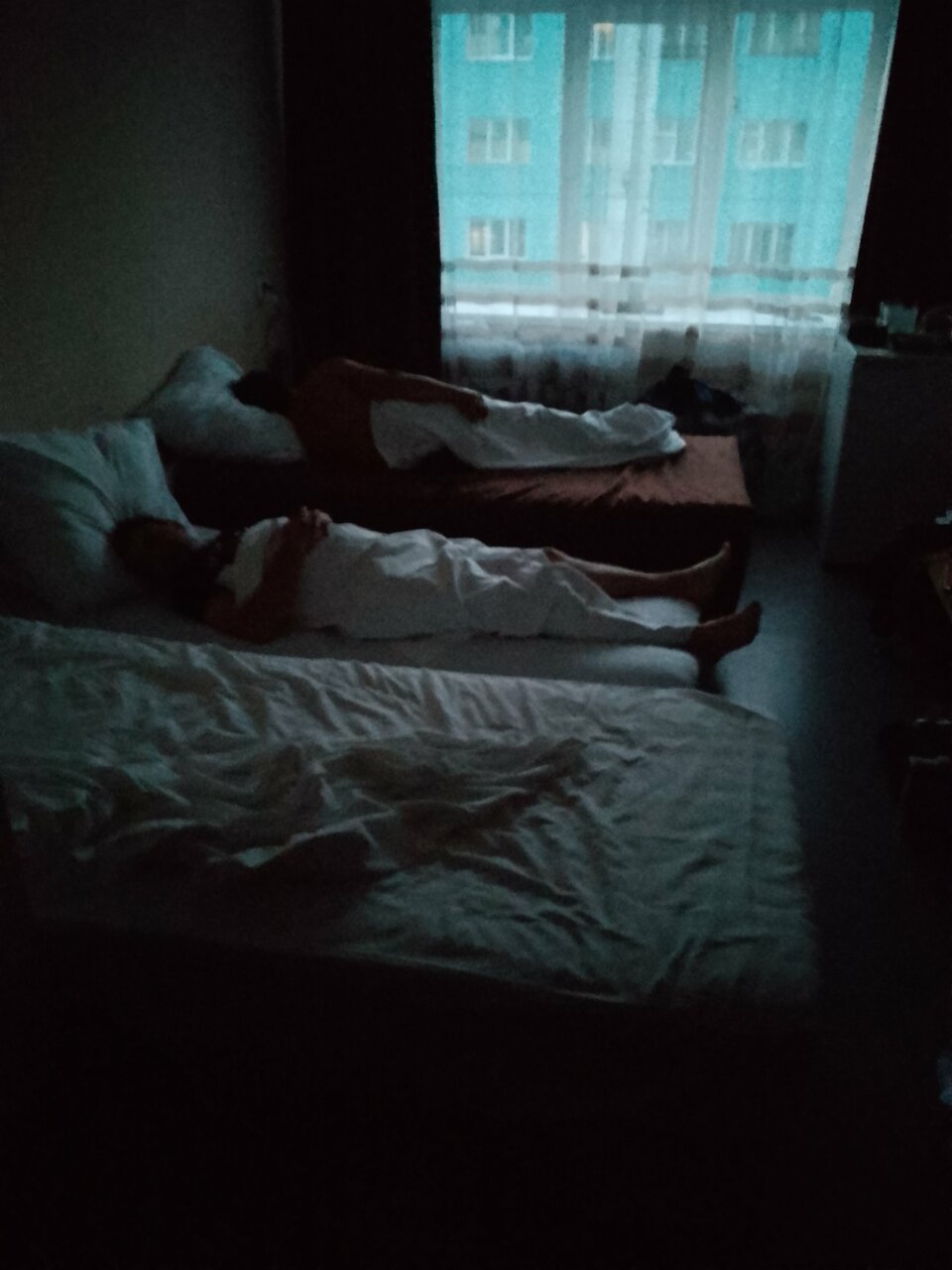 Хорошая гостиница, но дорогая. Сняли с коллегой двухместный номер, отдали по 3000 с человека. В номере две односпальные кровати, совмещённый душ с туалетом, холодильник, чайник, телевизор. На столе стояли две бутылки бутылки минеральной воды, одна с газом, одна без.