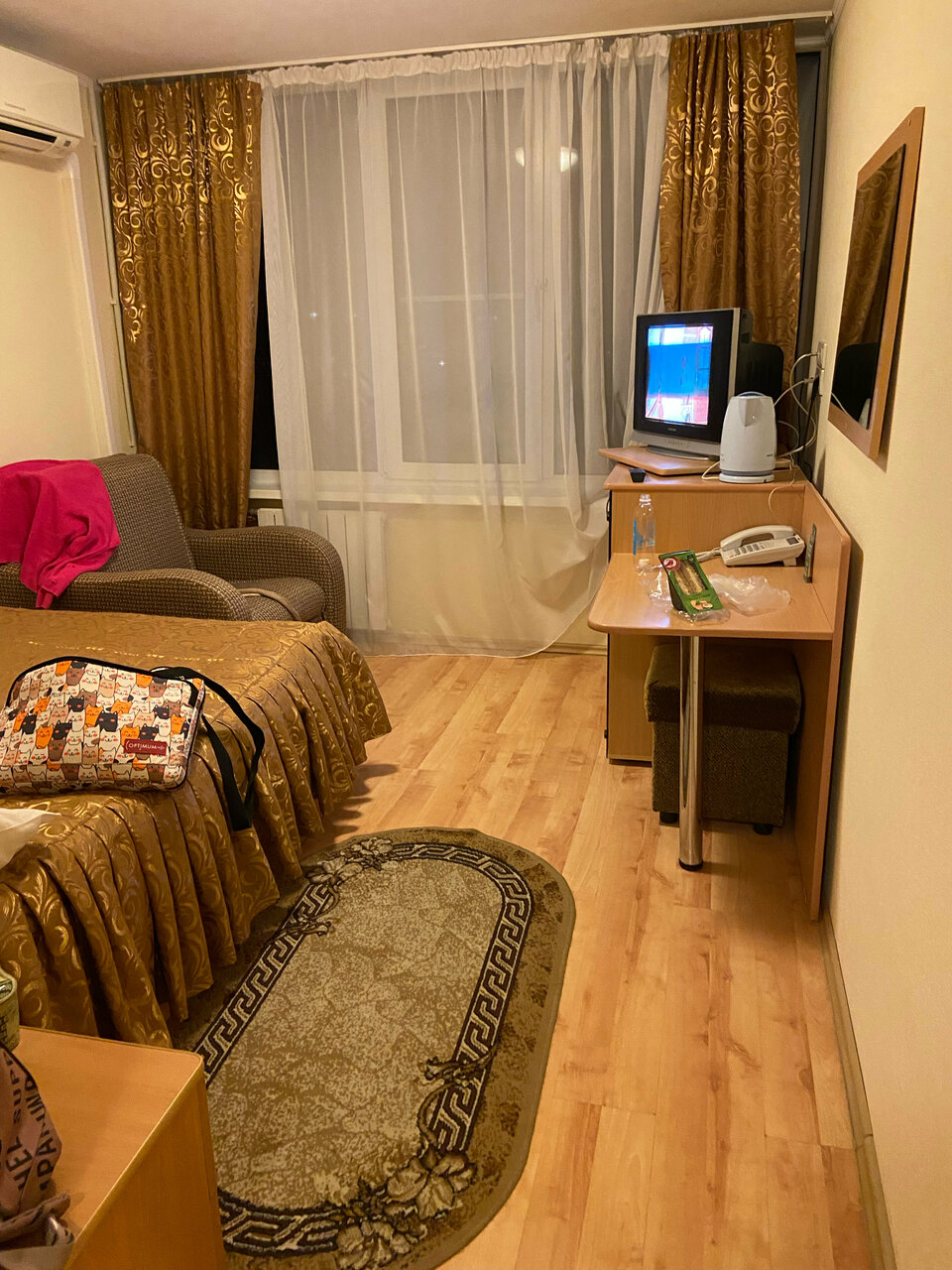 Телевизор плохо показывал, просила чтобы настроили — никто так и не пришёл. Холодильник гудел как трактор. От чайника запах пластмассы. Все очень скромненько.