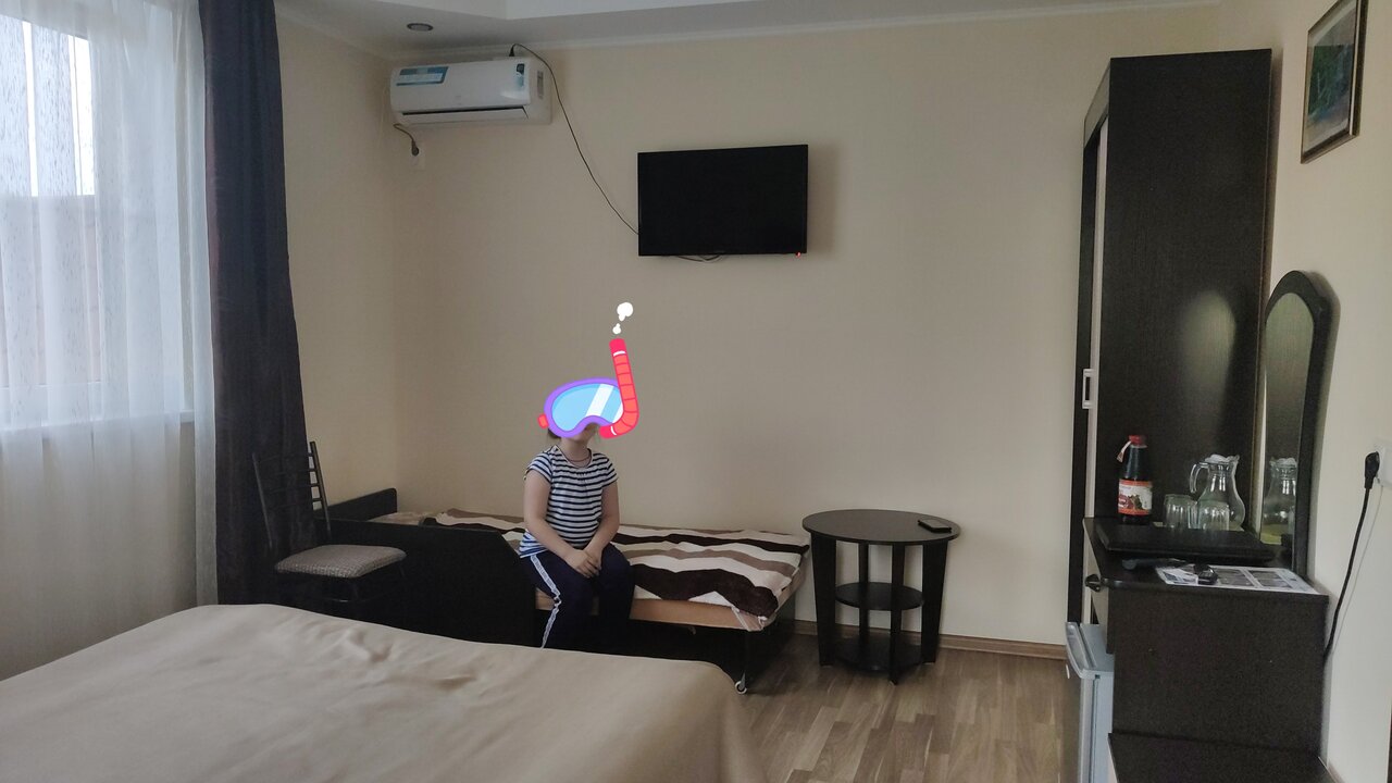 Приятные хозяева, Галина и Давид, уютный номер. Завтраки включены в стоимость, что очень удобно. На завтрак, на выбор, несколько блюд, вечером Галина спрашивает что будут гости на завтрак. Утром можно, за отдельную очень дешёвую стоимость заказать вкусный суп на обед или, если планируете целый день отсутствовать, суп на ужин. В номере есть полотенца, по 2 на каждого гостя, небольшой холодильник, телевизор, кондиционер, тумбочка, комод, фен, у нас был чайник в номере. на столике, относящемуся к номеру, есть чай, кофе, перец, соль, сахар. Для детей есть площадка с игрушками и горкой. На общей кухне можно готовить, для каждого номера предусмотрен отдельный шкафчик с тарелками, кружками и столовыми приборами. Кастрюли, сковородки общие. Купаться мы ходили на лиман, минут 20 пешим ходом с детьми, не быстро. Можно туда доехать на машине. Давид предоставляет услугу такси по Ейску, можно посетить парки, дельфинарий , рынок и т.д..