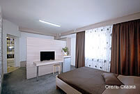 Площадь номера - 35 кв.м., площадь балкона - 6 кв.м.В номере:двуспальная кровать, прикроватные тумбочки;двуспальный диван;зеркальный шкаф-купе;обеденный стол, стулья, шкафчики для посуды;холодильник;плазменный телевизор 32 дюйма с каб