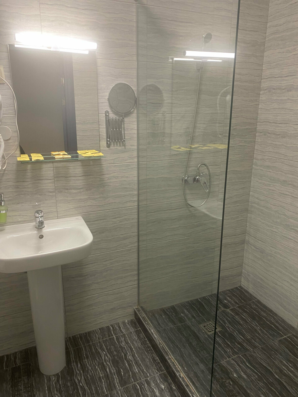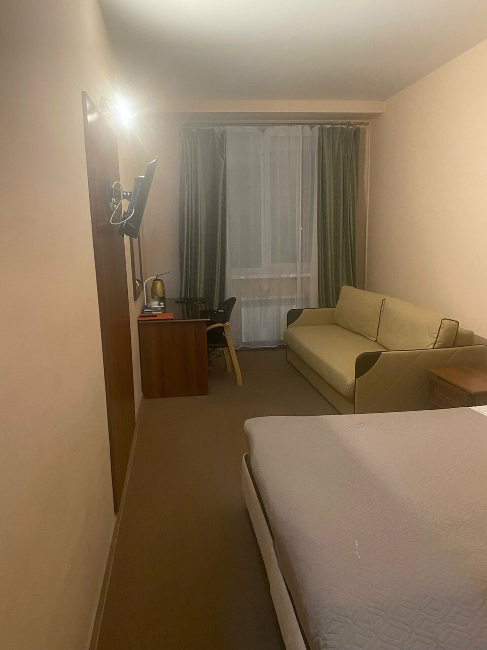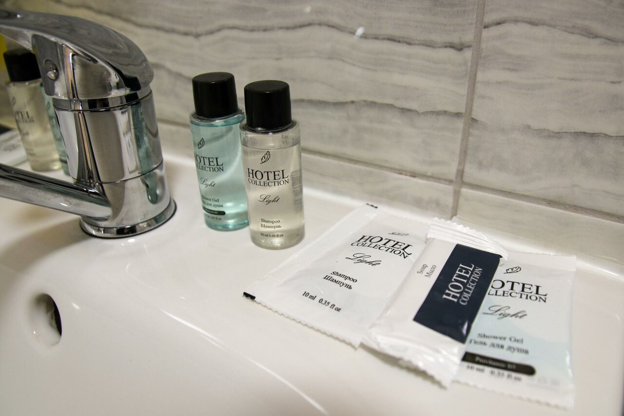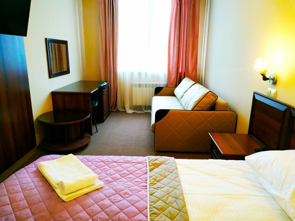 Срочно бронировали номер люкс, семья с двумя детьми. Через 10 минут уже заселялись и в номере лежал комплект белья для детей на раскладной диван. Номер просторный, есть абсолютно все необходимое, современный Единственное, что неприятно удивило — стены все заляпаны…вот прям много, хотя они покрашены и думаю при желании эти пятна можно отмыть, а часть точечно закрасить. Завтрака в самой гостинице нет, но есть кафе на другом этаже. В вс оно работало с 9 Завтрак простой, но очень сытный, взяли две порции на всю семью. 1 порция: каша, глазунья+сосиски, колбаса, сыр, брынза, хлеб, эклер, чай.