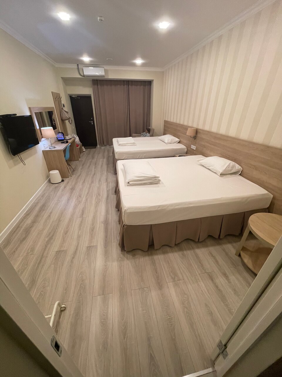 Номер за 3500 норм, но не хватает комплект одноразовых зубных щёток. P.s.: Не включайте кондиционер, иначе тяжёлый запах то-ли сигарет, то-ли буд-то что то где то прокурено или фильтры грязные, ну в общем обеспечен. Номера по 6 квадратов, что полторашку стоят, слижком замкнуто, окон нет. У кого клаустрофобия, лучше даже не смотрите.. а так если немного прибухнуть и спать, то норм, одному… если спать в двоем, то уже стены мешают
