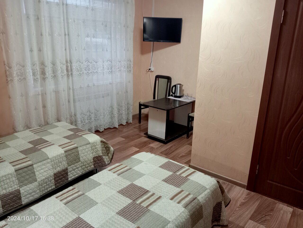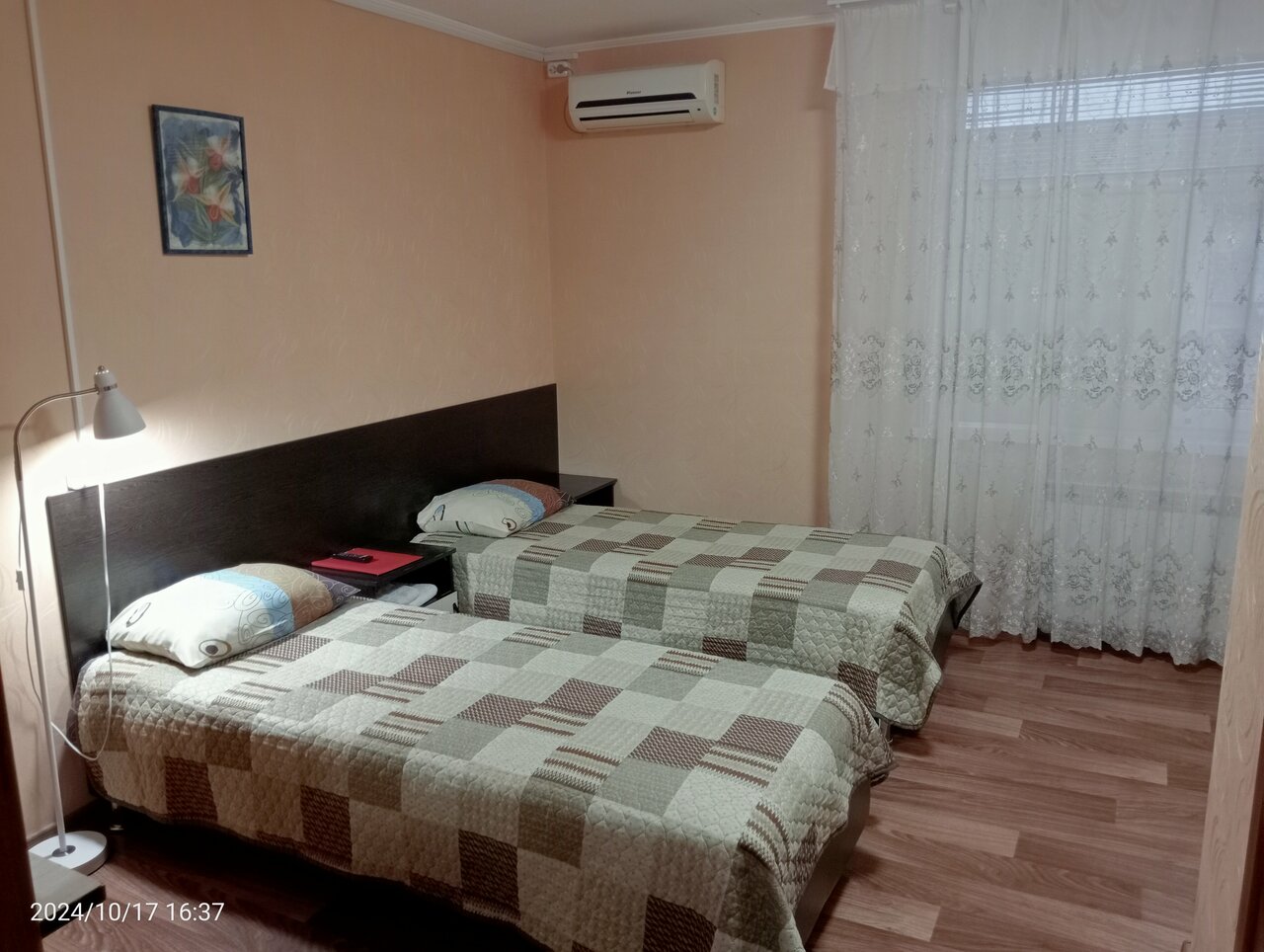 По дороге останавливались на ночь. Заранее написала Вотсапп, созвонилась. Номер на троих. Окно во двор. Стоянка во дворе за закрытыми воротами. Есть холодильник в номере( доп. 2 на этаже), чайник, кулер, микроволновка, кондиционер. На окнах москитные сетки. Удобно, что переносная лампа. Предлагали чай, сахар. Приветливый персонал. Просто, чисто, достаточно тихо. Кровати нормальные.