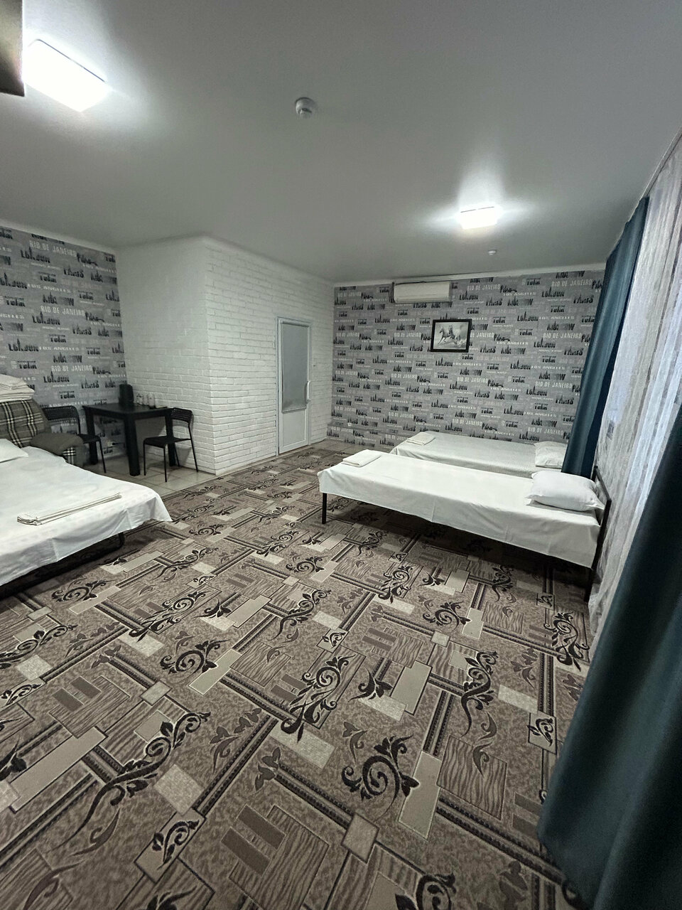 Жили в большом номере в деревянной постройке на улице, Кровати хорошие так вроде все и не плохо но сама постройка видно сделана на скоро руку и с экономикой строительных материалов:пол весь ходуном ходит, соседей слышно как разговаривают ну и утеплителя и шумоизоляция никакой, как утро начинается слышно каждую машину которая проезжает по дороге у тебя за степной.