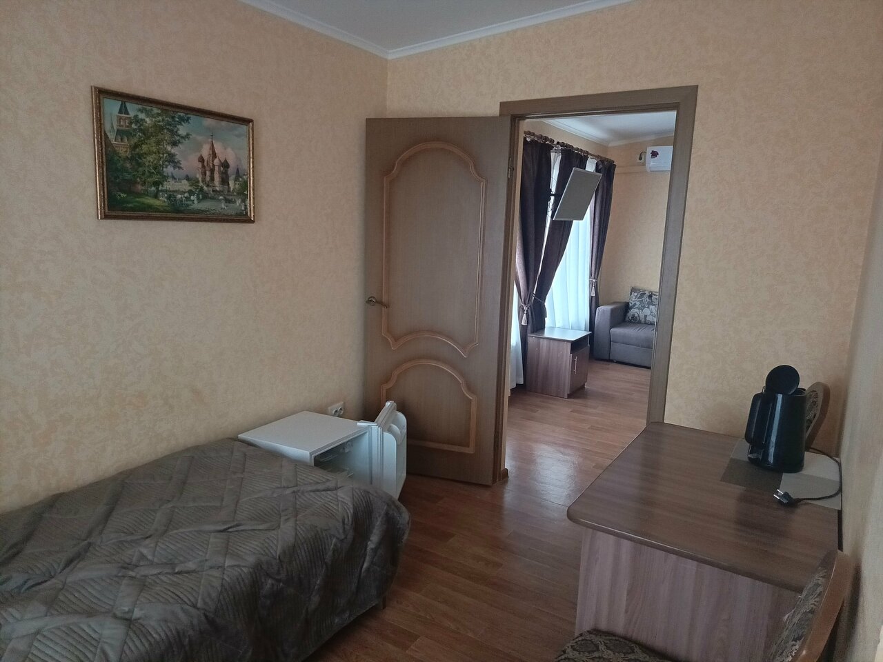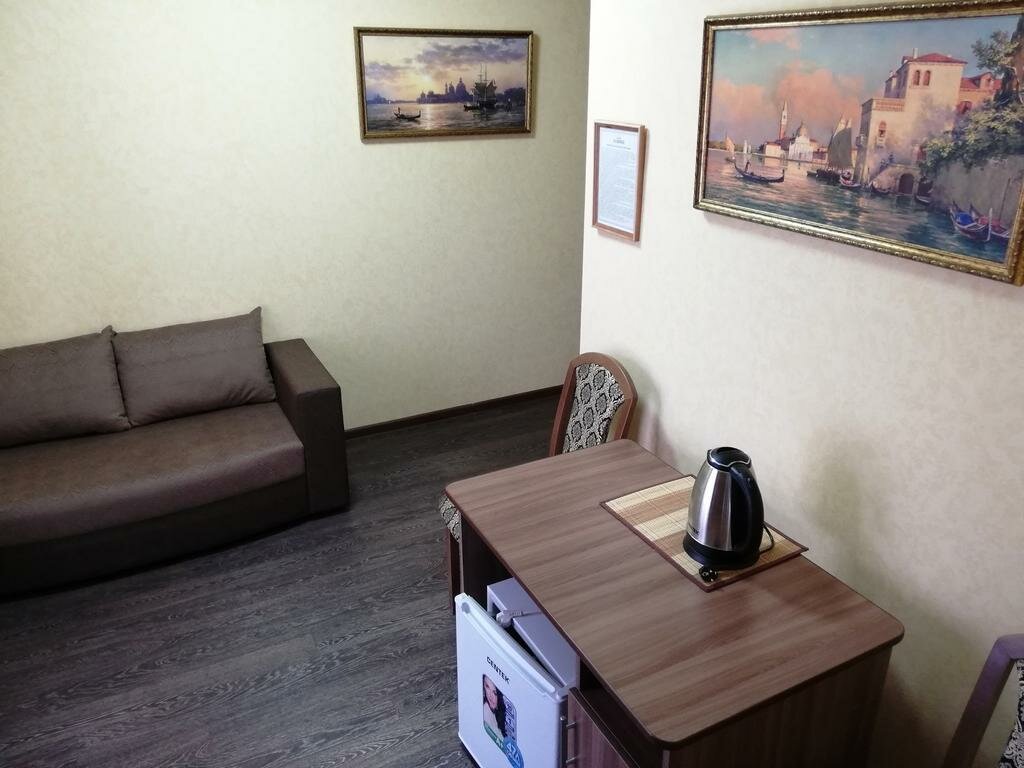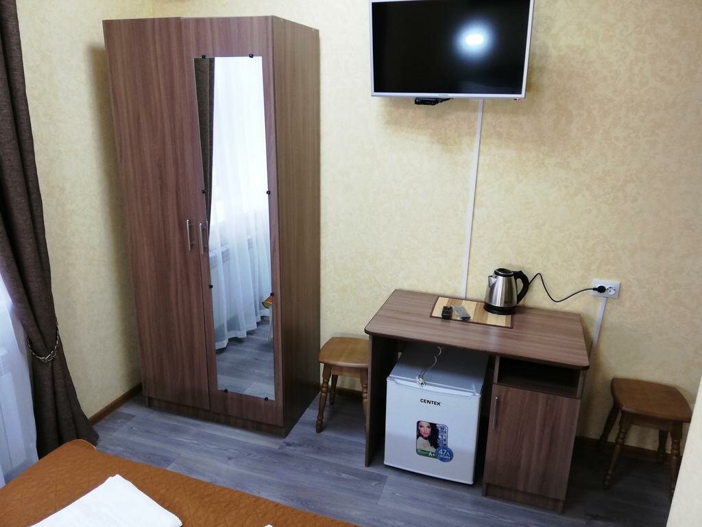 Номер хоррший, есть холодильник, чайник и столовые приборы. Есть стоянка для машины. Как недостаток отсутствует бойлер с чистой водой.