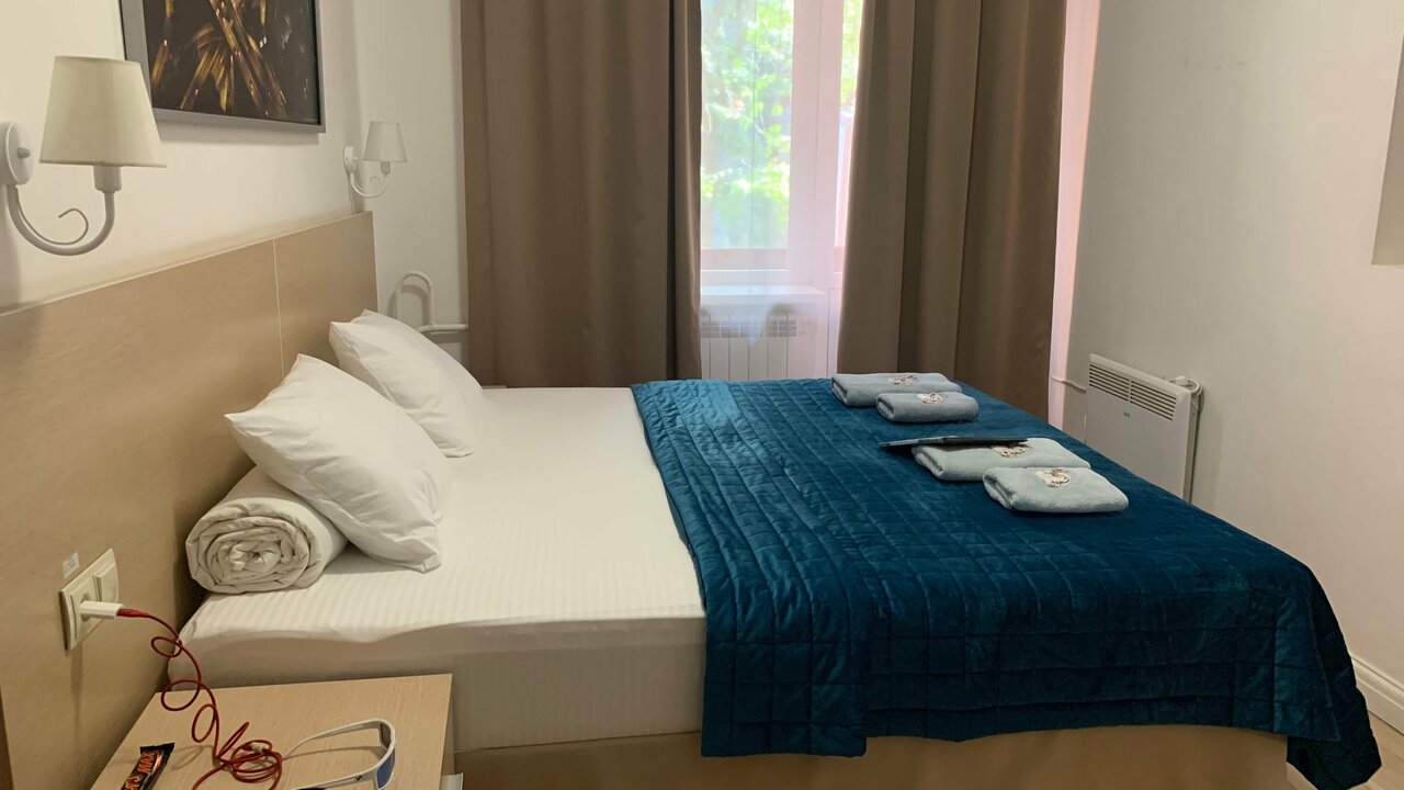 Забронировали на сайте Яндекс.путешествия. Сутки за 2 взрослых и ребенка 6 лет стоило 3300 рублей. За счёт местонахождения по утрам очень шумно, так как отель находится на территории центрального рынка и окна выходили на него. Но если вы турист, то от данного отеля недалеко находятся основные достопримечательности города, с ребенком пешком обошли все. В отеле очень слабый wi-fi, телевизор из-за этого невозможно было смотреть. Из плюсов: очень добродушный администратор, быстрое заселение, очень чистый номер, хорошее постельное белье, подушки и матрас. Для ребенка отдельный маленький диванчик. В номере есть посуда, чайник, кулер с водой, пару пакетиков чая, кофе и сахара нет. Выдали по 2 полотенца на человека и 2 пары тапочек. В ванной комнате есть шампунь, гель для душа, мыло для рук.