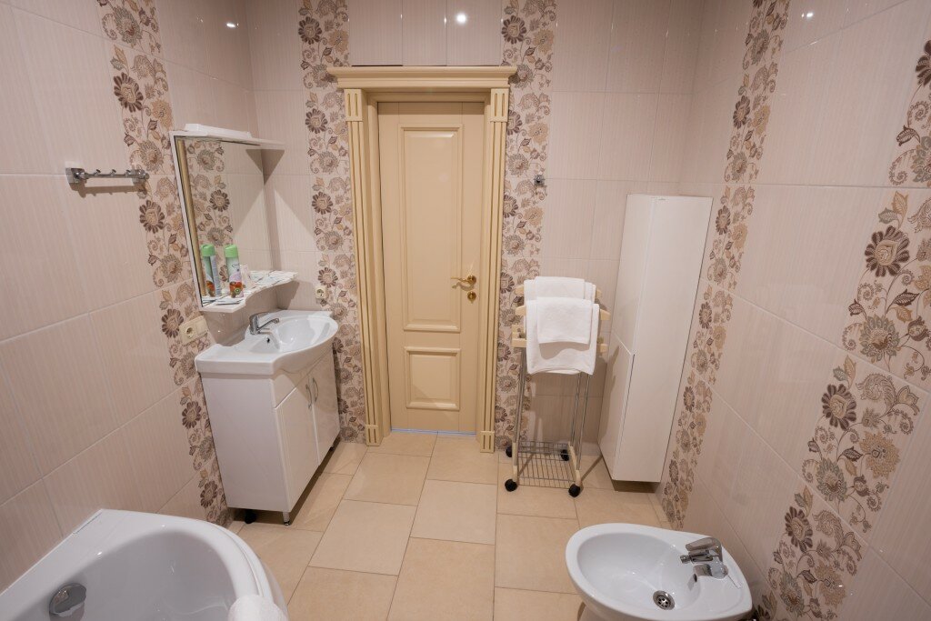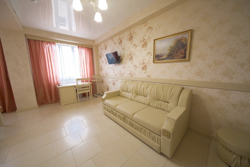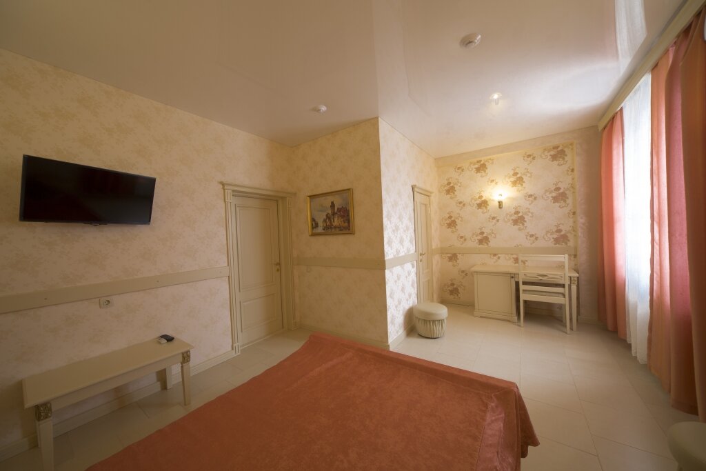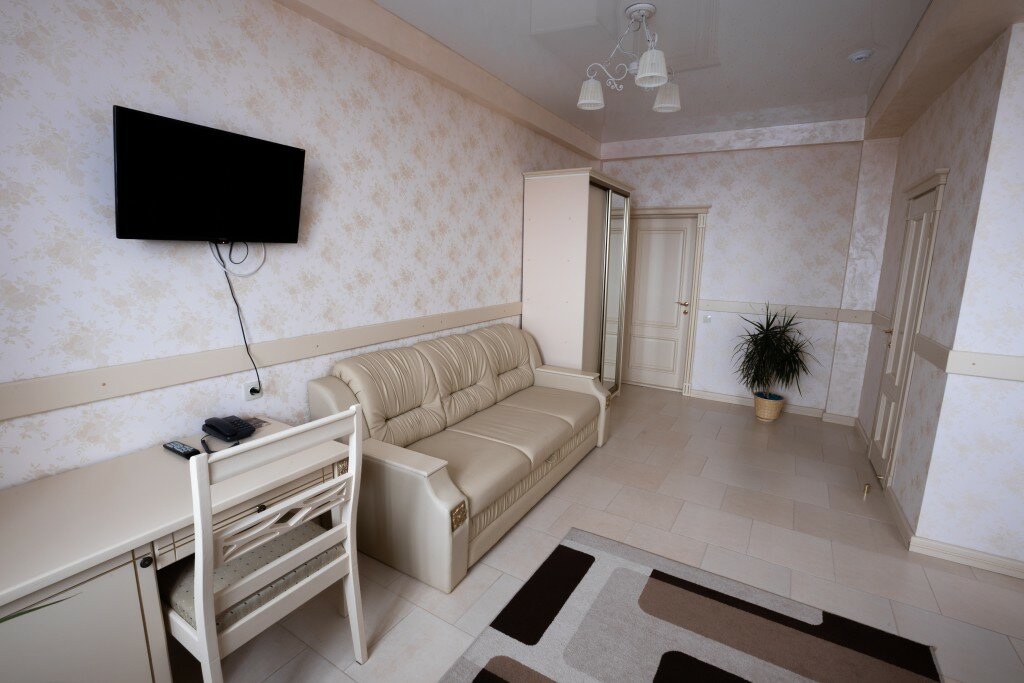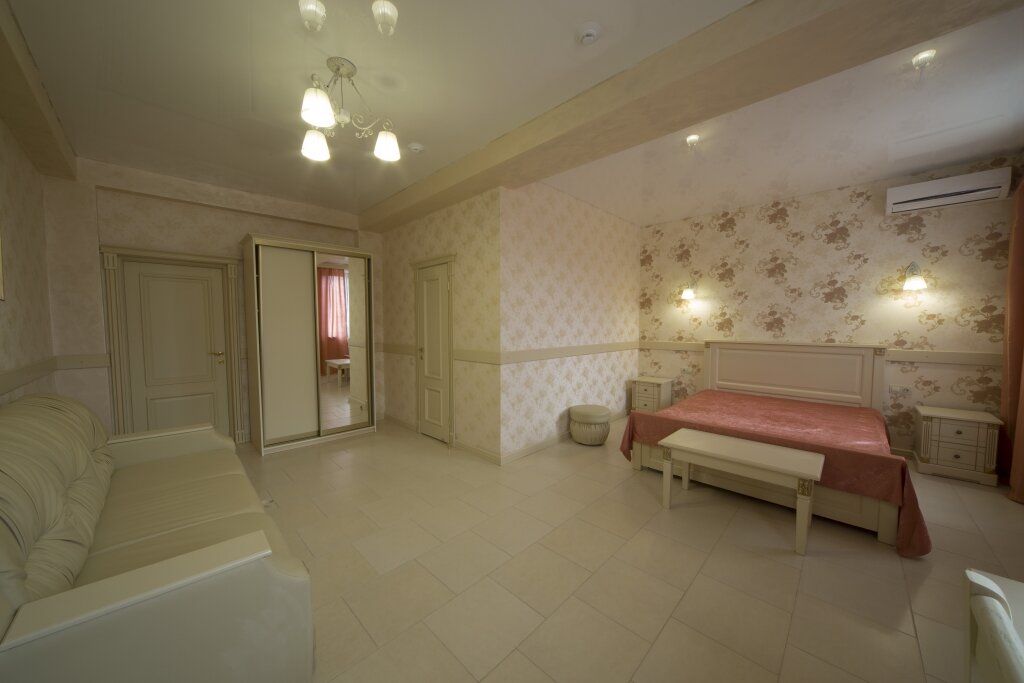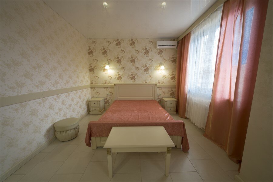 Номер Люкс 1 2-х спальная кровать, 2 тумбочки, шкаф, стул, пуфики ,кондиционер, телевизор, совмещенный санузел с ванной и биде, халаты, набор полотенец, гигиенический набор, тапки., Интернет Wi-fi, телефон