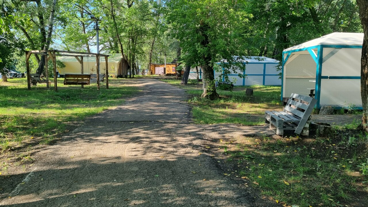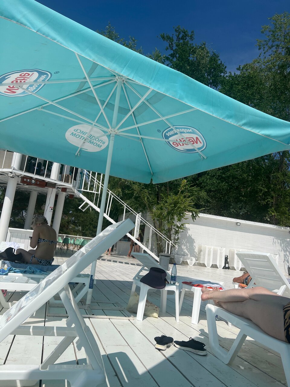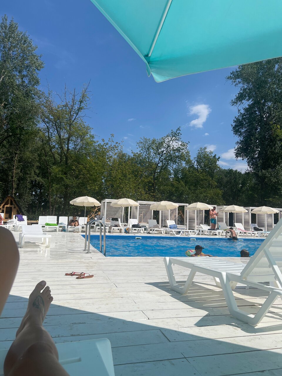 + Можно подъехать на авто к беседке Беседки просторные, расположены на комфортном расстоянии друг от друга. Есть холодильник, мангал. Умывальники, несколько душевых кабин — посещение не ограничено. В туалетах унитазы и сливные бачки. Учитывая, что они, всё-таки уличные, чище, чем в некоторых заведениях общепита. Вода теплая, накупались от души - В беседке шаталась одна лавка ( с детьми не очень удобно) Мангалов, видимо, меньше, чем беседок и домиков, т.к. 2 раза пытались у нас забрать. Местами водоросли в воде. Самый главный минус — комары (снимали беседку, есть домики). Как только стемнело, нас ‘сожрали’, пока ждали такси, которое, кстати, не охотно едет туда, больше часа пытались уехать.