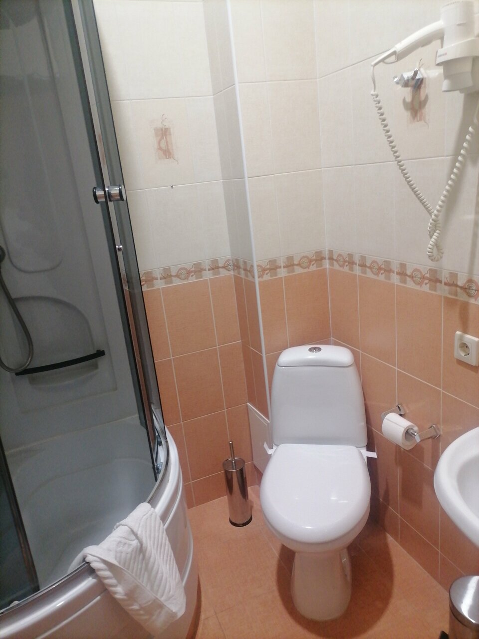 Относительно новая гостиница. Недорогие номера. Плохая звукоизоляция. Питьевая вода в кулере в общем коридоре. Скромный завтрак. Убитая душевая кабина. Неудобное расположение унитаза.