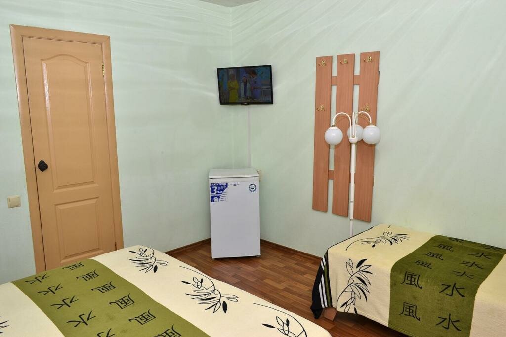 Небольшой гостевой дом. На 12 номеров. До моря 10 метров, спуск по лестнице. Номера небольшие, в 3-х местном 3 — им будет тесно. На фото (оф сайт) размер комнаты выглядет побольше. В номере чайник, чашки, стаканы, тарелки, нож, штопор. В санузел туал бумага, мыло, освежитель и тазик. Около номера сушилка с прищепками. Хорошие хозяева. До пляжа 10 мин пешком, до остановки трамвая 1 5 мин, рядом маршрутка 6(до супермаркета Фрэш 5 остановок, до оз Майнаки(грязи) — конечная)