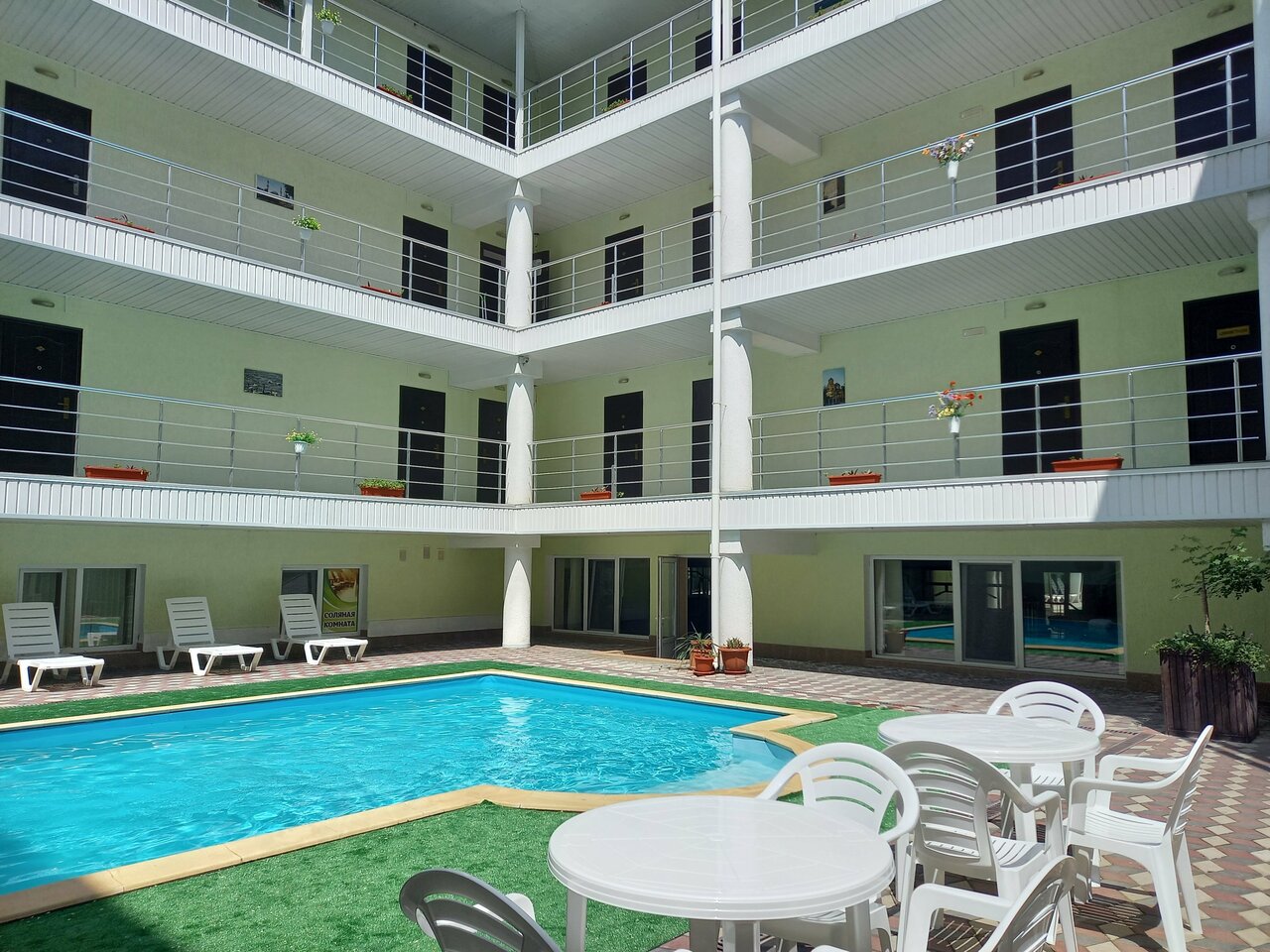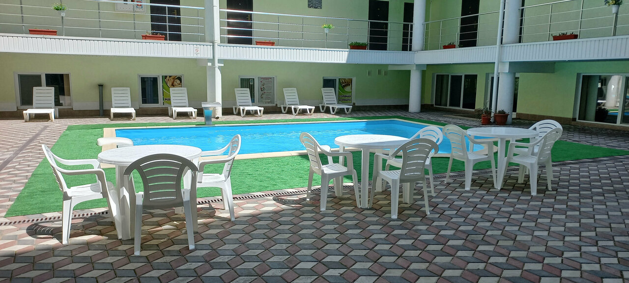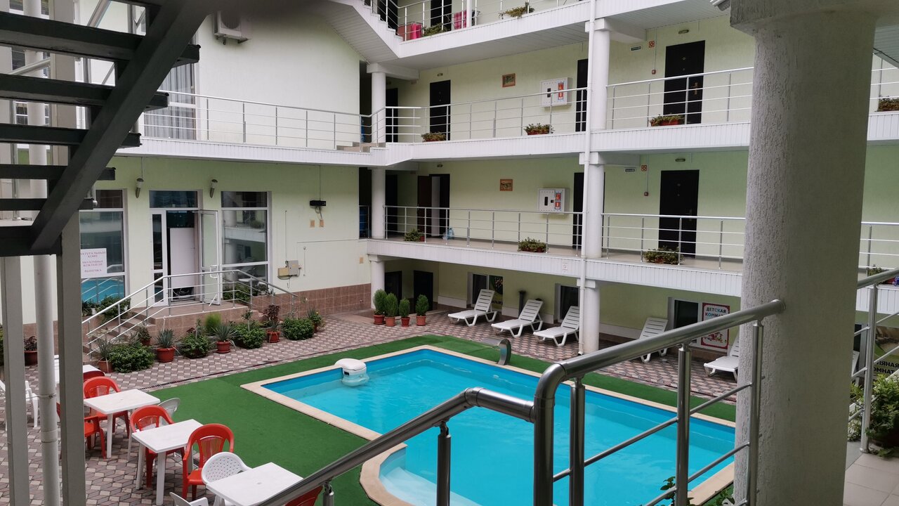 Чисто случайно попали в данный отель. За сутки писали прям всем подряд , что нужно разместиться на 3-4 дня. Мест не было, но что- то там или кого- то передвинули ( не суть ) и нашли нам две комнаты , вроде полулюкс они назывались на 3 этаже. Место отличное, до море недалеко, но пляж там совсем плохой, ездили на маршрутке пару остановок до нового пляжа( вот там сказка). Магазин прям в отеле, где все нужное есть. Вот столовую не оценили мы( да, мы брали размещение без питания) оплачивали на месте и в столовой какие- то хамовитые женщины, ничего не объяснят не покажут, но настроение что б не портить- туда просто не ходили, проблем со столовыми нет. Понравилось , что прям закуточек такой, тихо, мирно все. Рядом заброшенные места, поэтому видов нет. Персонал отеля замечательный. Гид по экскурсиям Дмитрий всегда поможет. Экскурсии дешевые и интересные. Будем в тех местах, точно поедем именно к ним