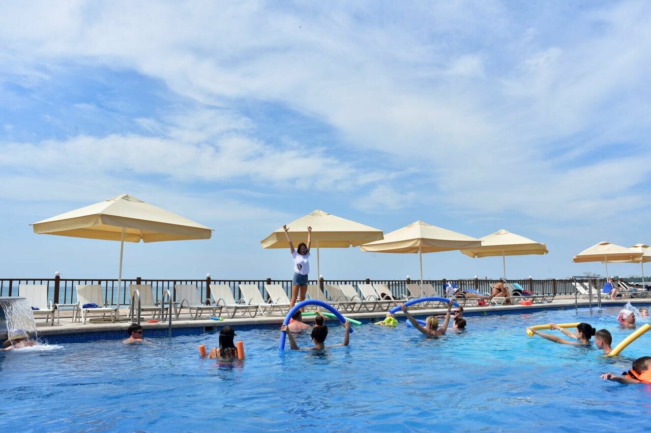 - Адекватные цены, наличие бара с вкусными напитками и едой.; Хорошие условия для отдыха с детьми.; Ухоженная территория с зеленью.; Удобное расположение (первая береговая линия, близко к пляжам).; Шикарный вид на море и бассейн.