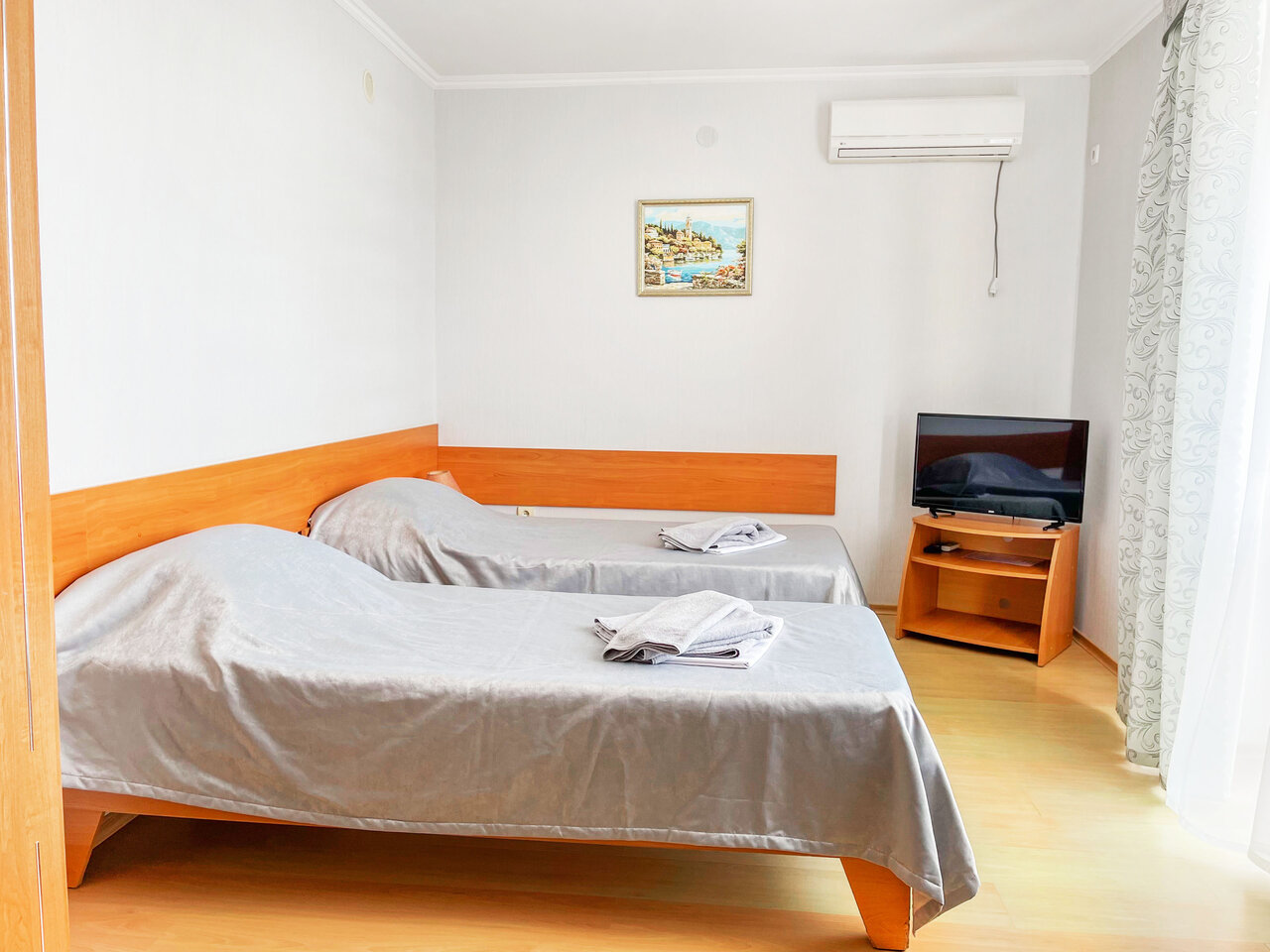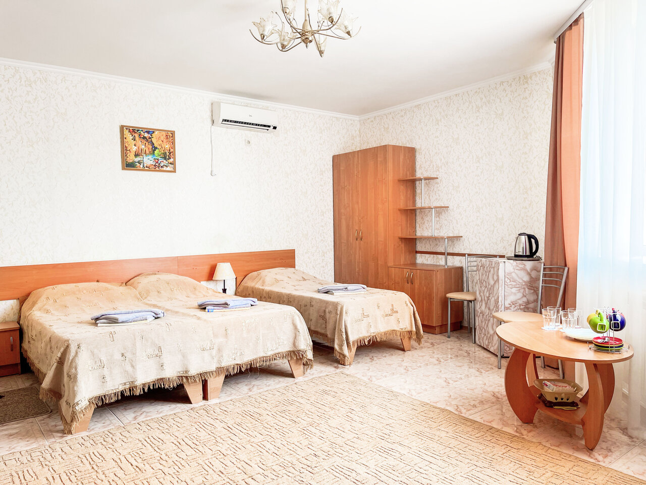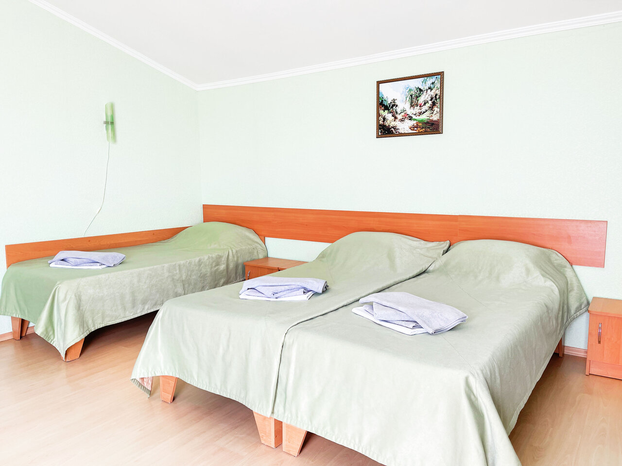 Отдыхали в июне 2023, все очень понравилось. Номер бронировали заранее на 2 взрослых. Хочется отметить, что территория хорошо обустроена (зеленая, чистая), детская площадка, парковка. Все необходимое в номере имеется, чистые полотенца, хорошие подушки, матрасы, хорошая сантехника, кондиционер, телевизор, камера хранения, в том числе вай-фай. Номер соответствует цене и качеству. Месторасположение отличное, прекрасный, благоустроенный пляж через дорогу. По поводу питания — тоже очень неплохо, рядом имеются столовые, кофейня, ресторан, все вкусно, всегда все свежее. Хозяева очень приветливые . Отдыхали не в первый раз, остались только хорошие впечатления. Рекомендую.