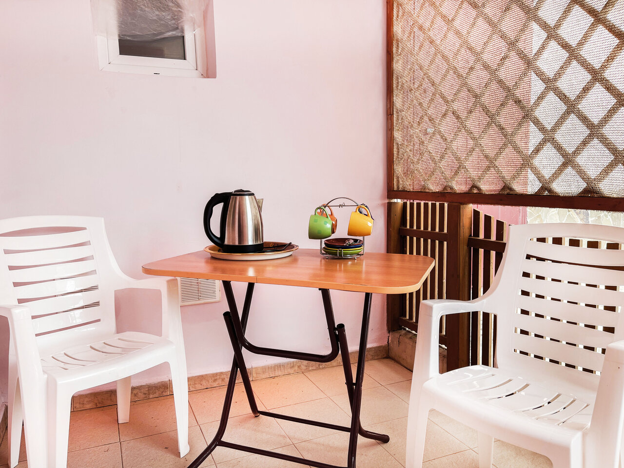 Двухместный номер стандарт с террасой и видом на море. Находится на первом этаже. Собственная ванная комната. Номер полностью укомплектован всей техникой, феном и чайником с посудой, гигиеническими принадлежностями.