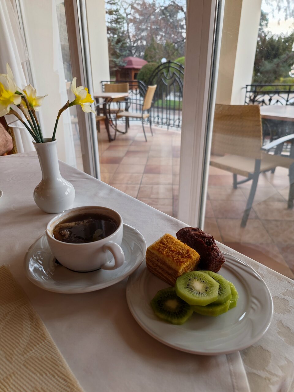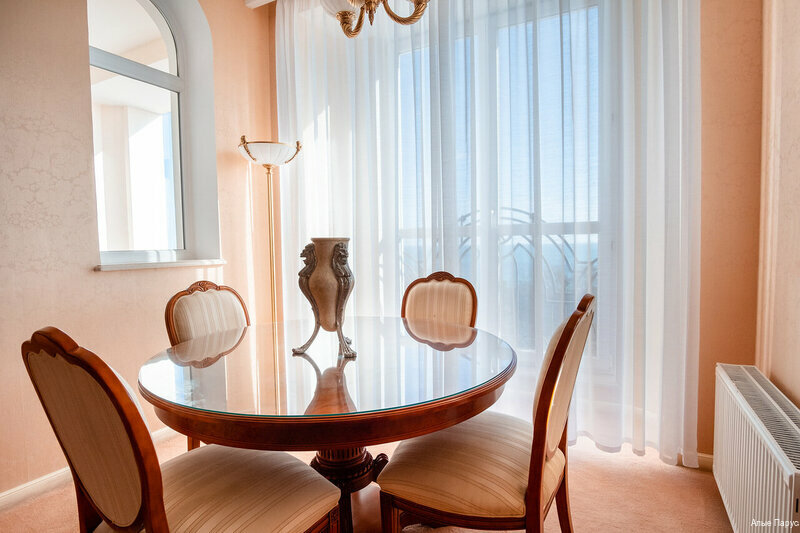В целом отель хороший, даже лучший в Феодосии. Завтраки вкусные и обильные. Персонал вежливый и приветливый! Территория отеля очень ухоженная и зеленая. Номер совсем небольшой, компенсируется большим балконом с видом на море! Мебель совсем уставшая. Вообщем требует ремонта. На пляж отвозит автобус, шезлонги бесплатно для проживающих в отеле. От отеля, на пляже имеется Семейное кафе — вкусно готовят и прекрасно обслуживают! Рекомендую мидии в сырно-сметанном соусе!