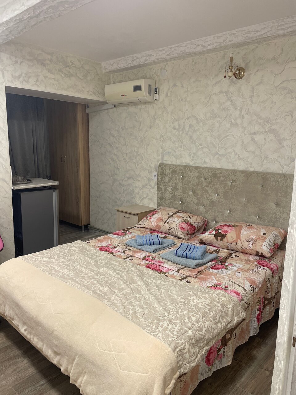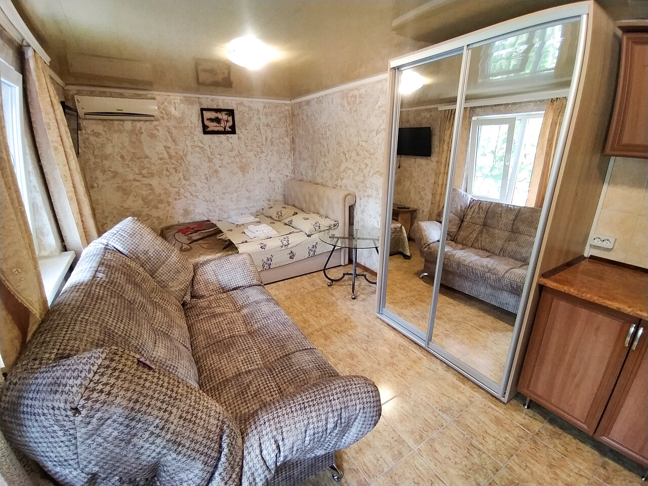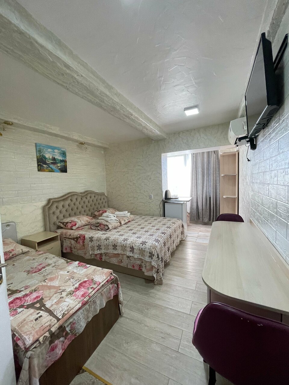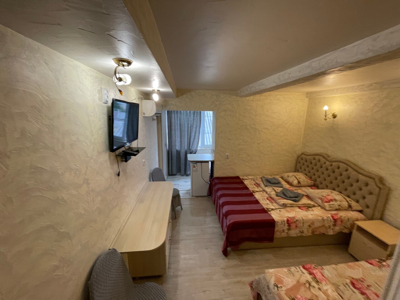 Уютный номер для семьи. 4 спальных мест. В комнате одна 2-х спальная кровать и две односпальные. Комната с хорошим ремонтом, есть тв , кондиционер, холодильник, чайник, сан-узел .