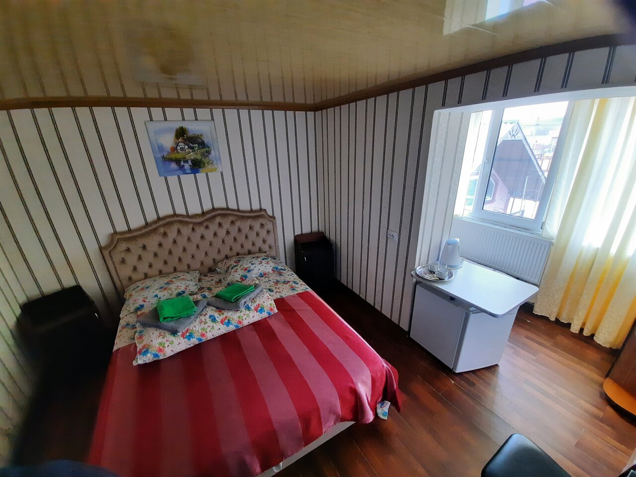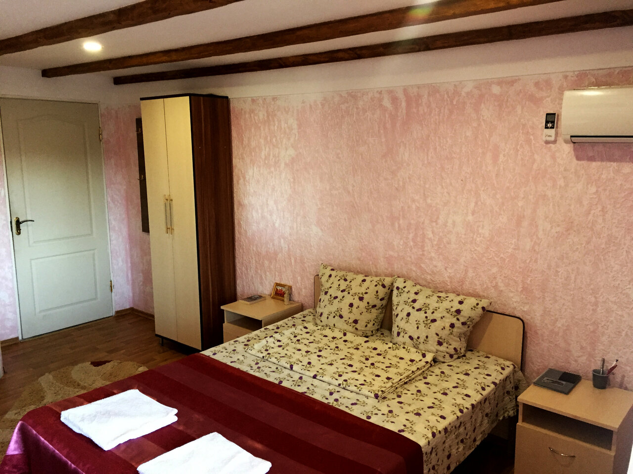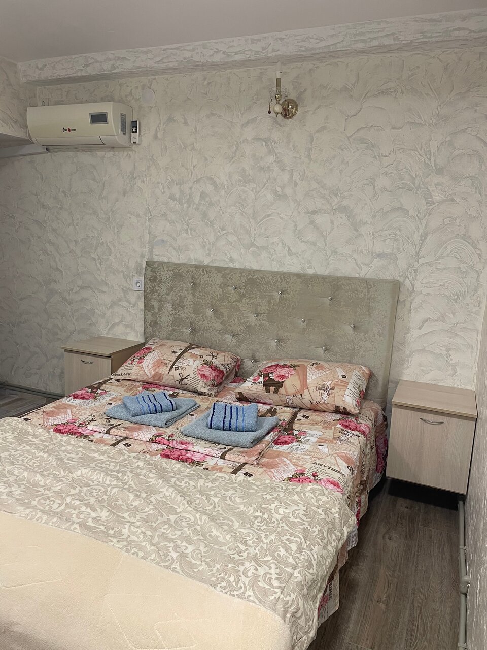 Уютный номер для семьи. 4 спальных мест. В комнате одна 2-х спальная кровать и две односпальные. Комната с хорошим ремонтом, есть тв , кондиционер, холодильник, чайник, сан-узел .