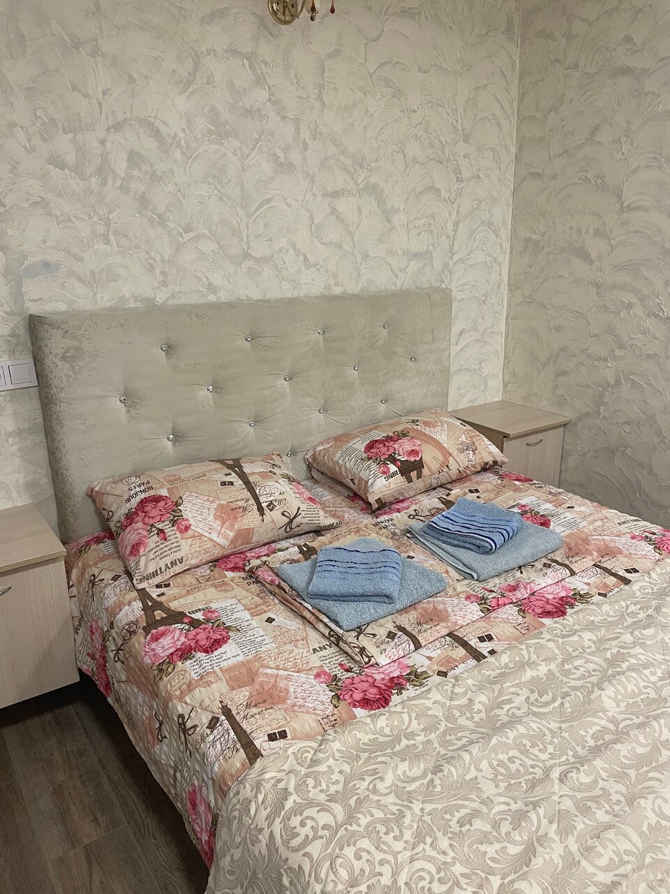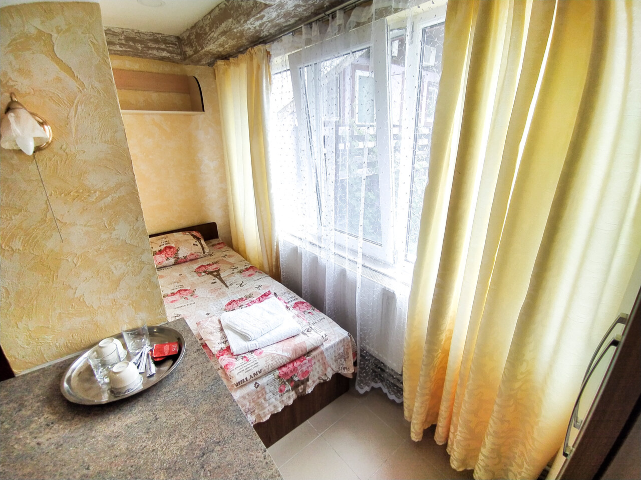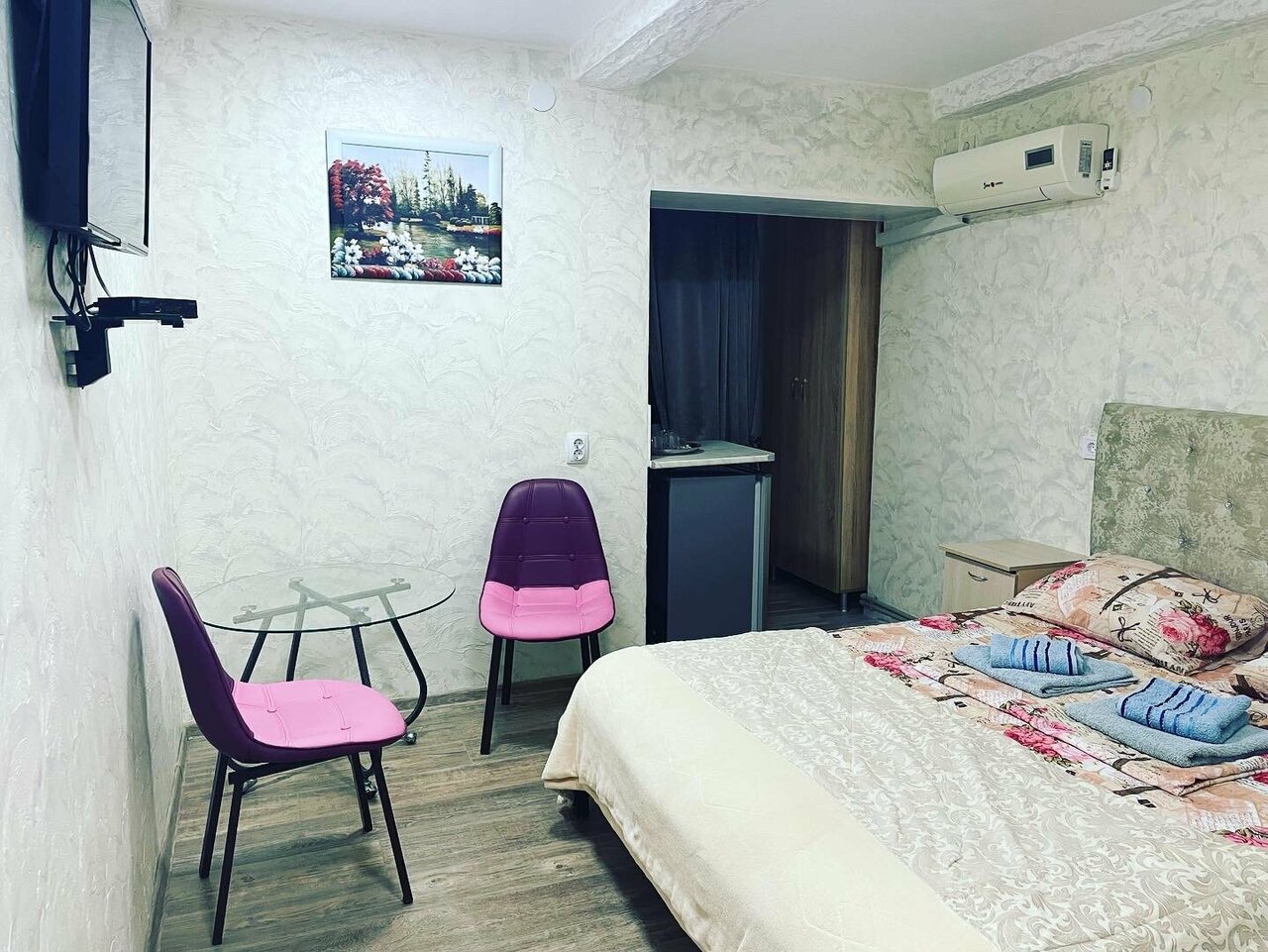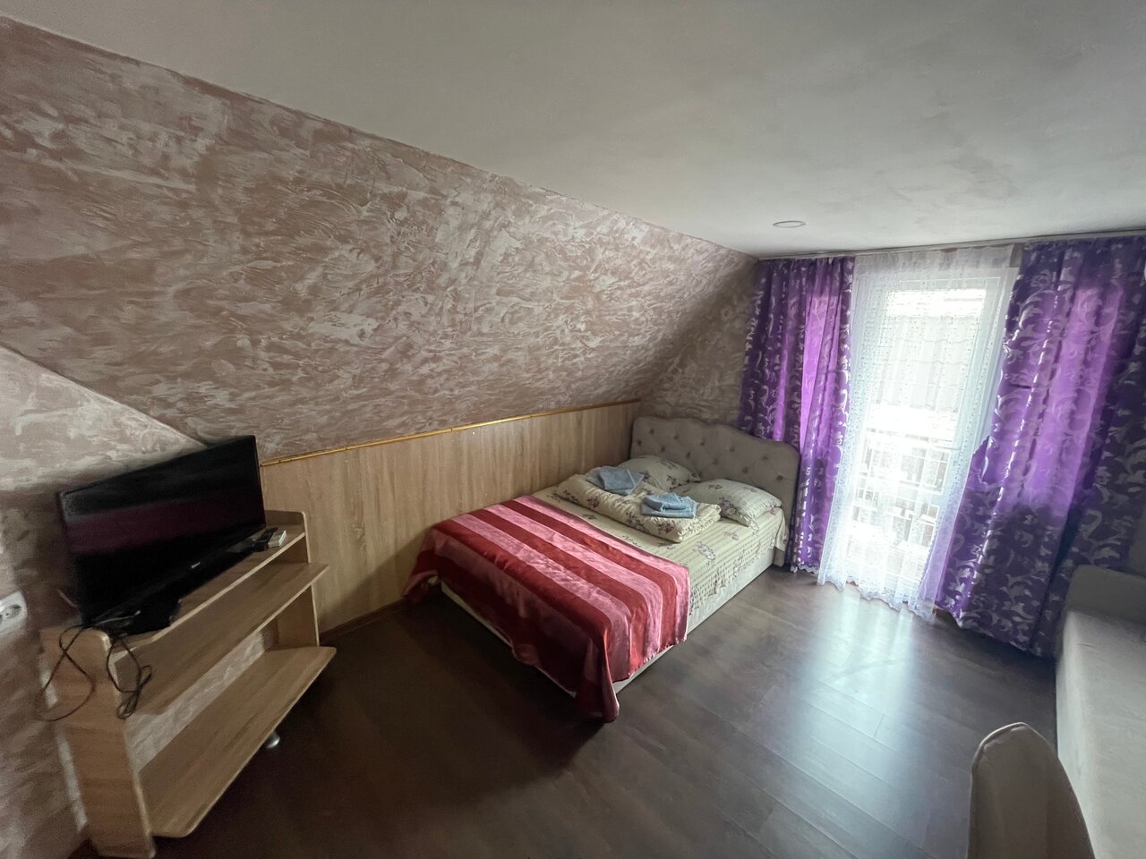 Уютный номер для семьи. 4 спальных мест. В комнате одна 2-х спальная кровать и две односпальные. Комната с хорошим ремонтом, есть тв , кондиционер, холодильник, чайник, сан-узел .