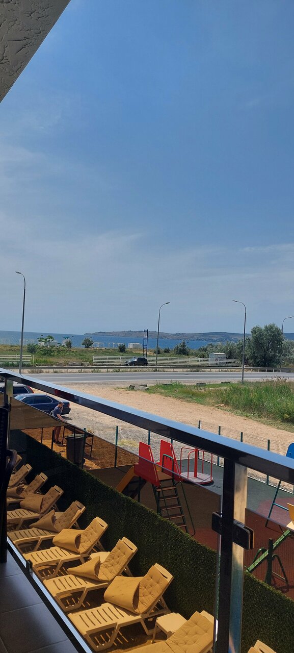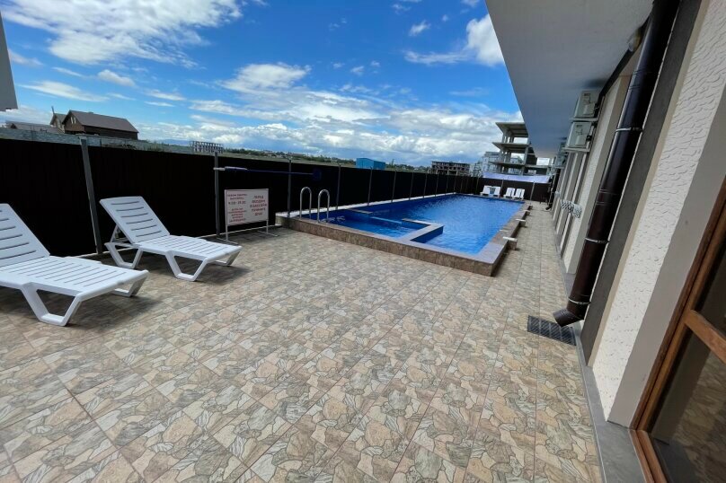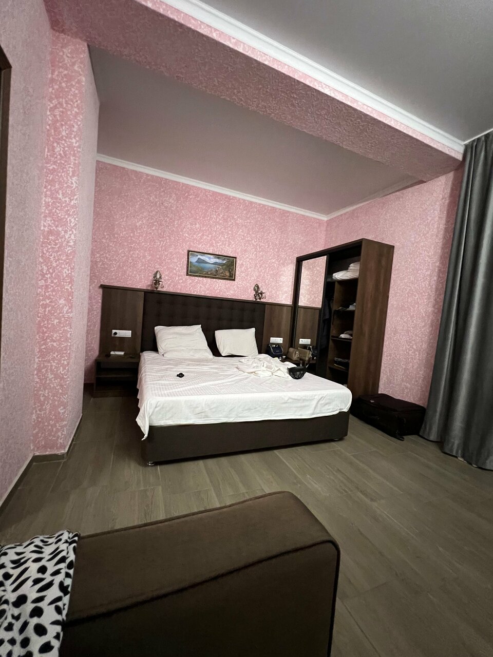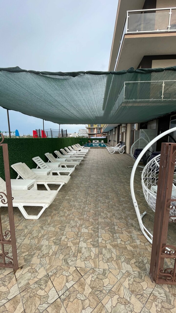 Отель новый, чистый. Уборка по вашей просьбе при вывешивании таблички. Были на третьем этаже в трехместном номере. Мебель новая, постельное и полотенца тоже. У нас был балкон с видом на море. Вид не очень, так как непосредственно лазурного моря нет, сначала видишь дорогу и только потом море. Есть свой бассейн, довольно приличный и глубокий с моим постом 167, мне по подбородок, есть для деток отдельный закуток, лягушатник.Вкуснаяя столовая на первом этаже, порции просто огромные. Единственное немного дороговато. Завтрак в среднем 500 р, обед 900-1000, ужин в районе 800 на двоих. Ну это конечно смотря кто, что берет, однако мы брали первое, второе и компот. Но еда, реально вкусная, сытная. А самыйиглпвный плюс, что чтобы попасть на море, нужно перейти дорогу и прямо напротив этого отеля светофор с пешеходным переходом. Другим отелям мало повезло с этим и по жаре не очень то хочется идти до перехода. Перебежать дорогу не удастся, так как трасса оживленная очень.